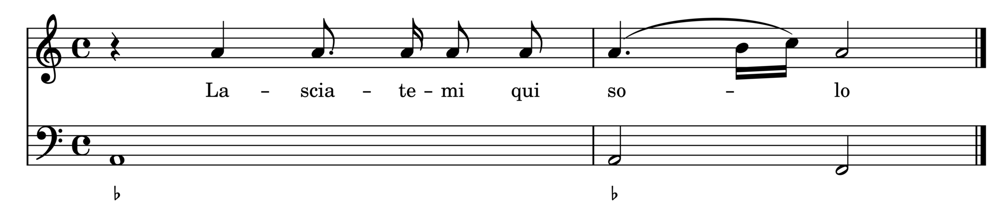 Francesca Caccini’s “Lasciatemi qui solo”—although vaguely recitar cantando in its textual setting—has a clear, repetitive stanza structure not seen in the other works. Each of the five parte are of roughly the same length and follow a similar harmonic progression, with slight lengthening in certain phrases to accommodate the written-out variations in the vocal lines.