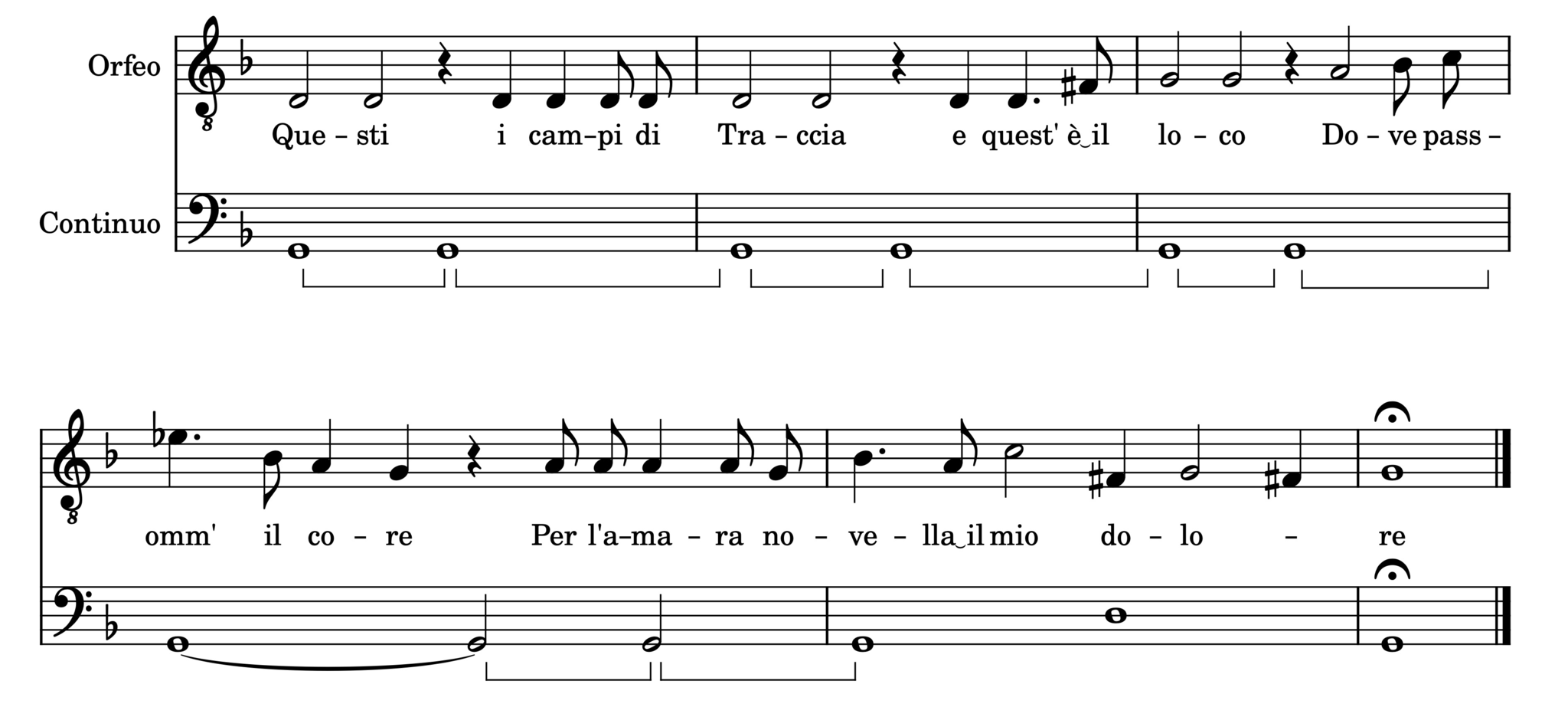The excerpt from Act V, Scene I of Monteverdi’s L’Orfeo begins with an extended drone in the bass. The relative inactivity of the accompaniment gives the singer ample opportunity to colour the language with declamatory efforts and the stressing of the notated dissonances. This simplicity also allows the colours of the voice to be audible, as the singer navigates several vocal registers within the short passage. The sudden harmonic change on the word “dolore” is a clear indication of the overarching subject of grief within the excerpt.