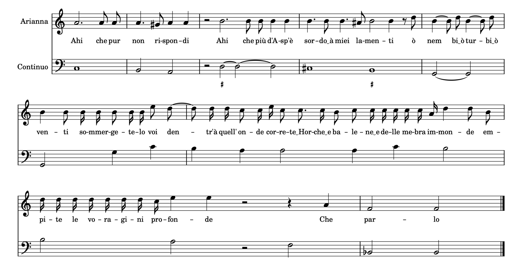 In the “Lamento d’Arianna”, Monteverdi utilizes the same techniques, beginning with a slow rate of change in the bass and later developing the accompaniment to match the increased urgency of Arianna. Example 2 is taken from the emotional climax of the Lament, as Arianna calls on the forces of nature to sink the ship on which Theseus sails away from her.