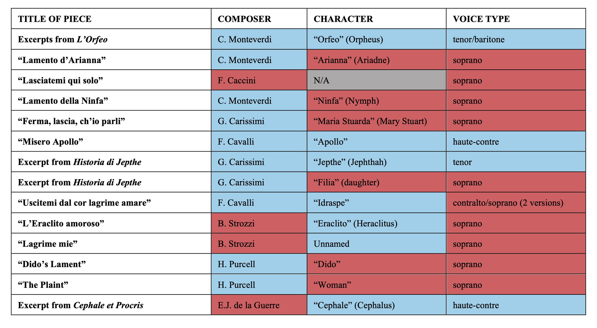 The roles of Apollo and Cephale are both intended for haute-contre; Jephte is billed as a tenor; and Orfeo is suitable for a tenor or high baritone. The absence of the bass voice within the Lament repertory may be due in part to the biological associations of higher voices with expressions of grief, but is more likely a result of the operatic trope-casting in which basses were often set as unwavering political forces, such as kings and gods.9