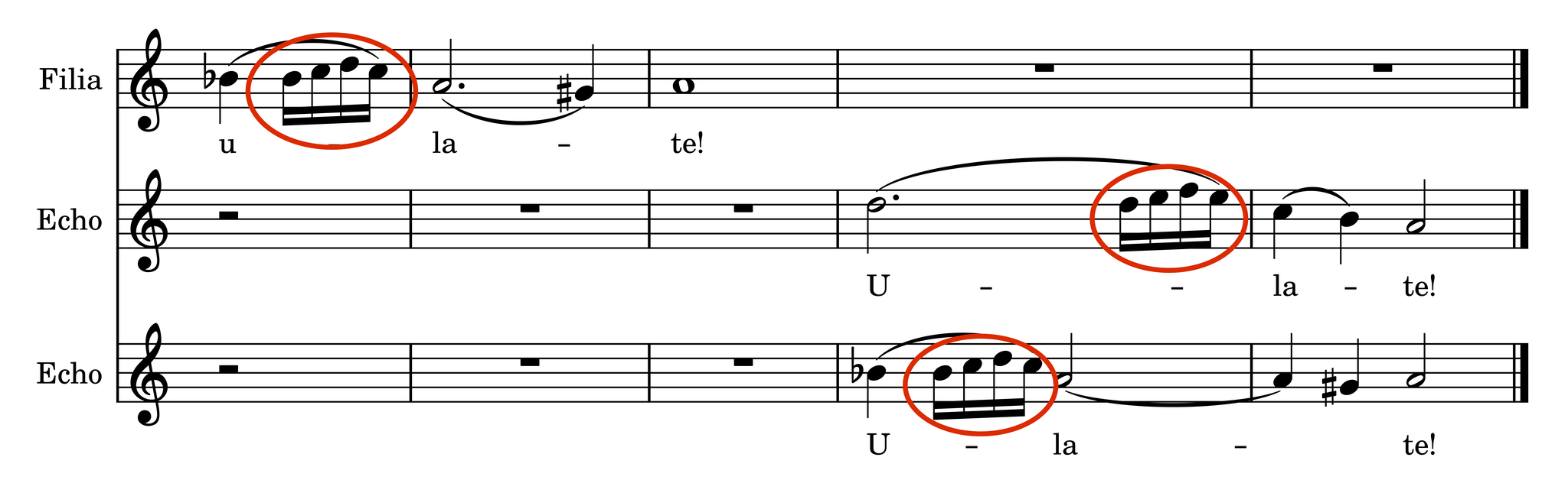 The cries of Filia are uttered as short sets of ascending sixteenth notes which are echoed (by two additional sopranos) in the caves as she wanders the mountains. These short gestures offer a direct physical correlation with the act of sobbing, as their executions require the same type of abdominal engagement that would naturally occur in an autonomous sob.