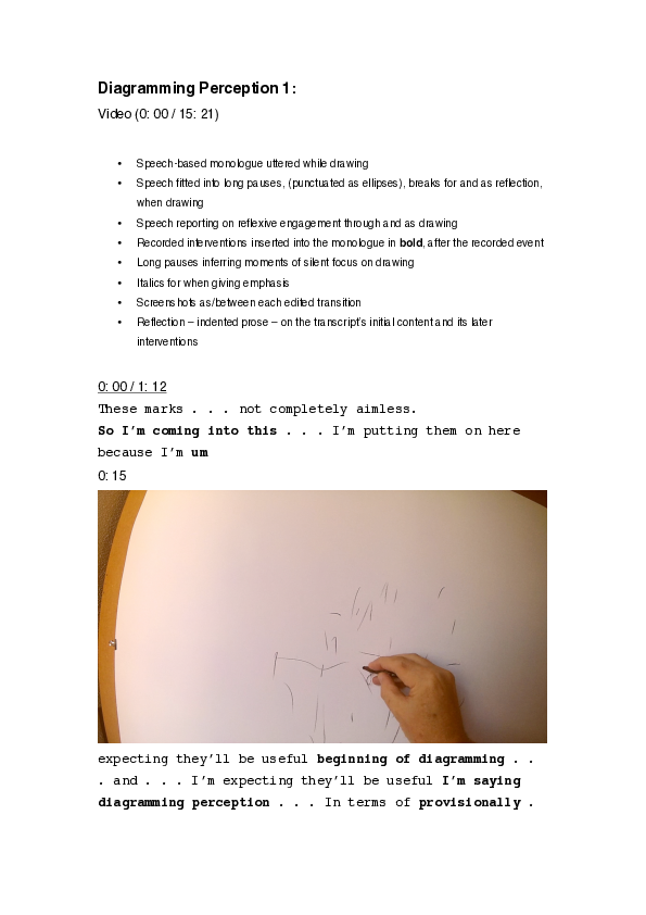 This artistic research is a contribution to a larger research project titled ‘The Observation of Perception, considered through drawing’, hosted by i2ADS. The research begins with the hypothesis that perception can be diagrammed, in this case through and as a form of drawing that indicates how perception is for this investigator conceived and works in action. One of the two visual motifs of the work is also a meta-motif, in that as an action-camera placed over the eyes, it is the means by which the investigator records himself at work on the second main motif, which is his image as viewed in a circular hand-held mirror. The investigator approaches the initiative as a question of diagramming the self-same initiative, accepting whatever are its developed implications as the aesthetic of the work. Peirce's division of the diagram into elements of firstness and secondness, with the elusive recognition of diagram as an abstract entity before any communicative purpose, keys into a working practice that in any case veers towards the diagrammatic. The investigator's tendency to audio-visually record his working process has led him to a position where the logistics of the purpose paradoxically reveal the subjectivity – if not absurdity – of the self-same process. In this case, little by little, a contingent factor of a wart takes centre-stage as blind spot; at-once a torn hole within the drawing's material surface, the action camera as an illusory obstruction, and a factor that oscillates with and as the circular self-portrait. The presentation takes the viewer/reader through the process, largely perceptual, that is diagrammed on and as the artifactual outcome, the drawing.