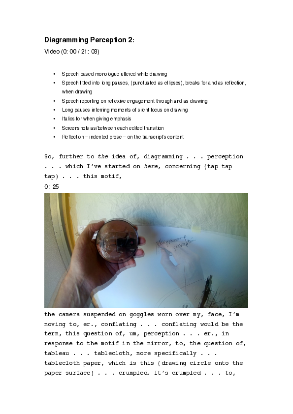 This artistic research is a contribution to a larger research project titled ‘The Observation of Perception, considered through drawing’, hosted by i2ADS. The research begins with the hypothesis that perception can be diagrammed, in this case through and as a form of drawing that indicates how perception is for this investigator conceived and works in action. One of the two visual motifs of the work is also a meta-motif, in that as an action-camera placed over the eyes, it is the means by which the investigator records himself at work on the second main motif, which is his image as viewed in a circular hand-held mirror. The investigator approaches the initiative as a question of diagramming the self-same initiative, accepting whatever are its developed implications as the aesthetic of the work. Peirce's division of the diagram into elements of firstness and secondness, with the elusive recognition of diagram as an abstract entity before any communicative purpose, keys into a working practice that in any case veers towards the diagrammatic. The investigator's tendency to audio-visually record his working process has led him to a position where the logistics of the purpose paradoxically reveal the subjectivity – if not absurdity – of the self-same process. In this case, little by little, a contingent factor of a wart takes centre-stage as blind spot; at-once a torn hole within the drawing's material surface, the action camera as an illusory obstruction, and a factor that oscillates with and as the circular self-portrait. The presentation takes the viewer/reader through the process, largely perceptual, that is diagrammed on and as the artifactual outcome, the drawing.