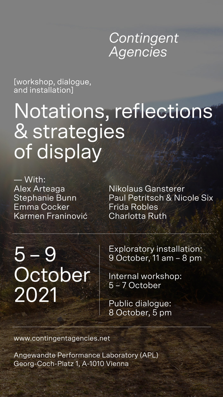 with: Alex Arteaga, Emma Cocker, Karmen Franinović, Nikolaus Gansterer, Paul Petritsch & Nicole Six, Frida Robles, Charlotta Ruth.