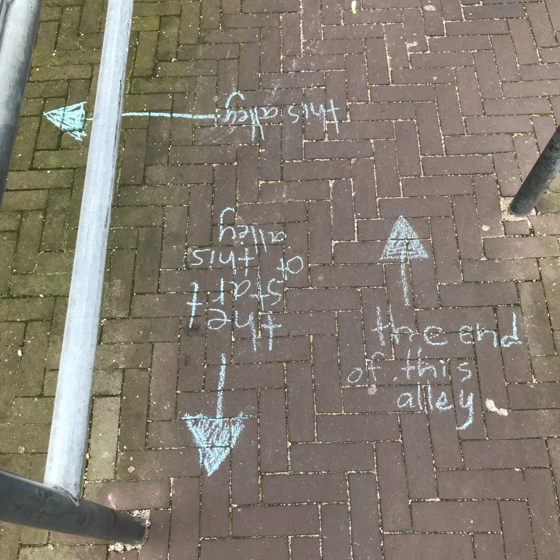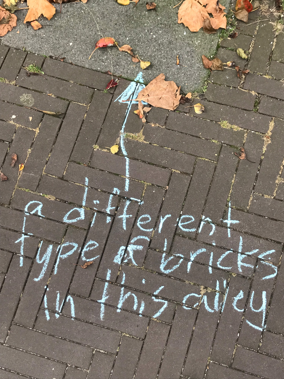 the brick floor of the alley provides a grid, like a math book.
