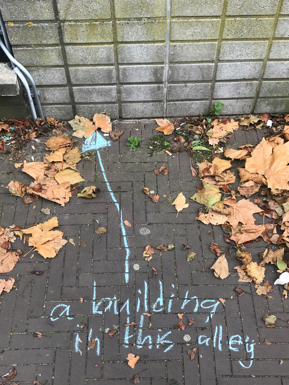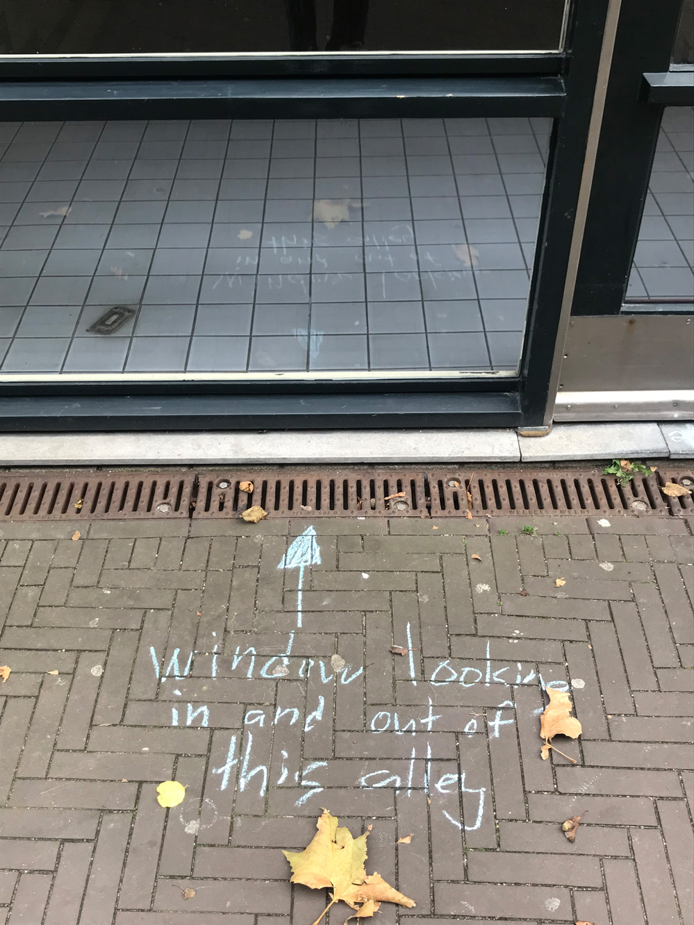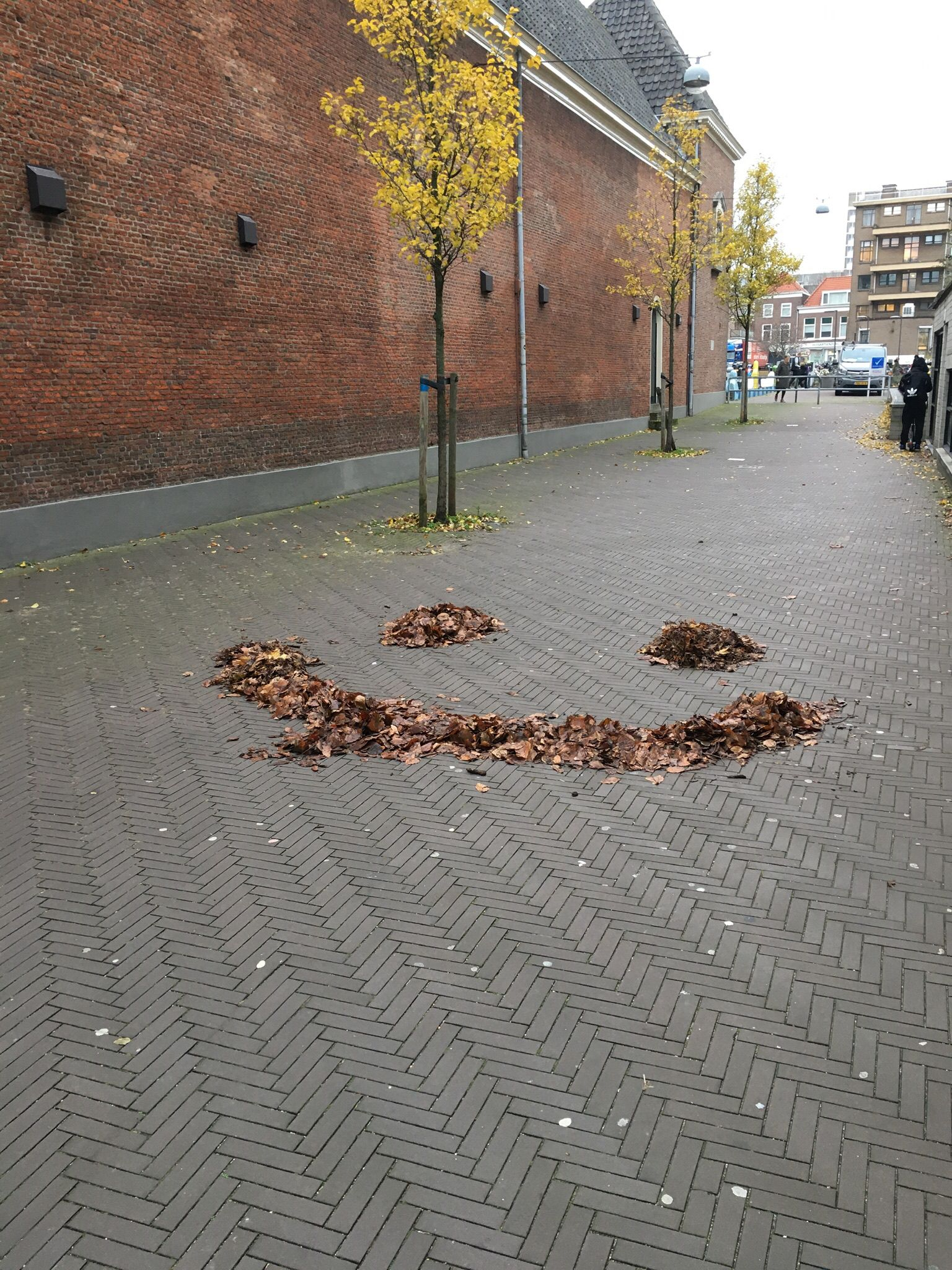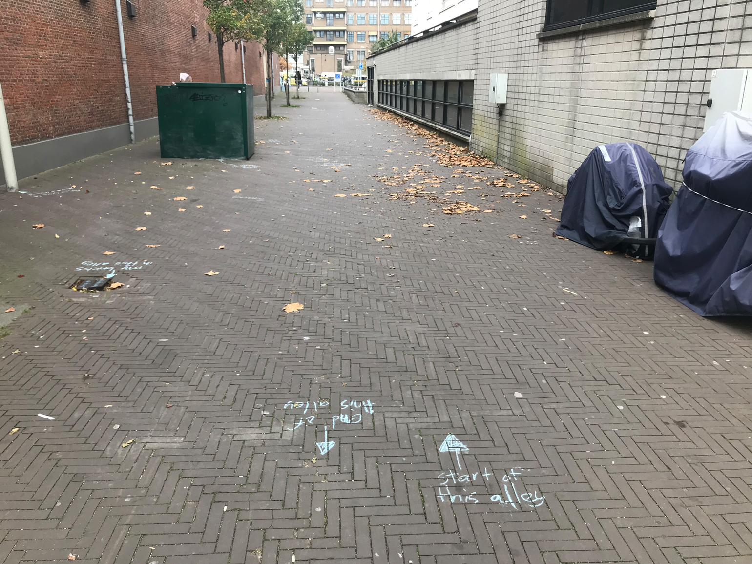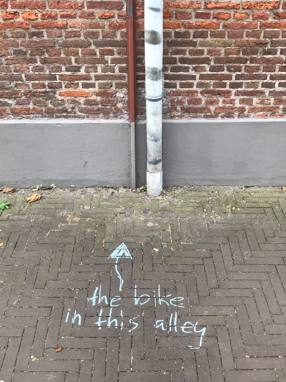 Since it’s autumn some dead leaves laid on the brick floor of the alley. They were mostly laying in the angle in between the alley brick floor and the wall of my building, but one was laying just in the middle of it. On closer inspection, I noted that over 90% of those leaves were from a maple tree, which does not exist in the alley. I later found that there are four maple trees growing outside the entrance of the hospital entrance in warmoezierstraat, and my guess is that the leaves in the alley come from there. The pear trees in the alley are still green, although they have lost their green summertime, photosynthetic prime time glow.