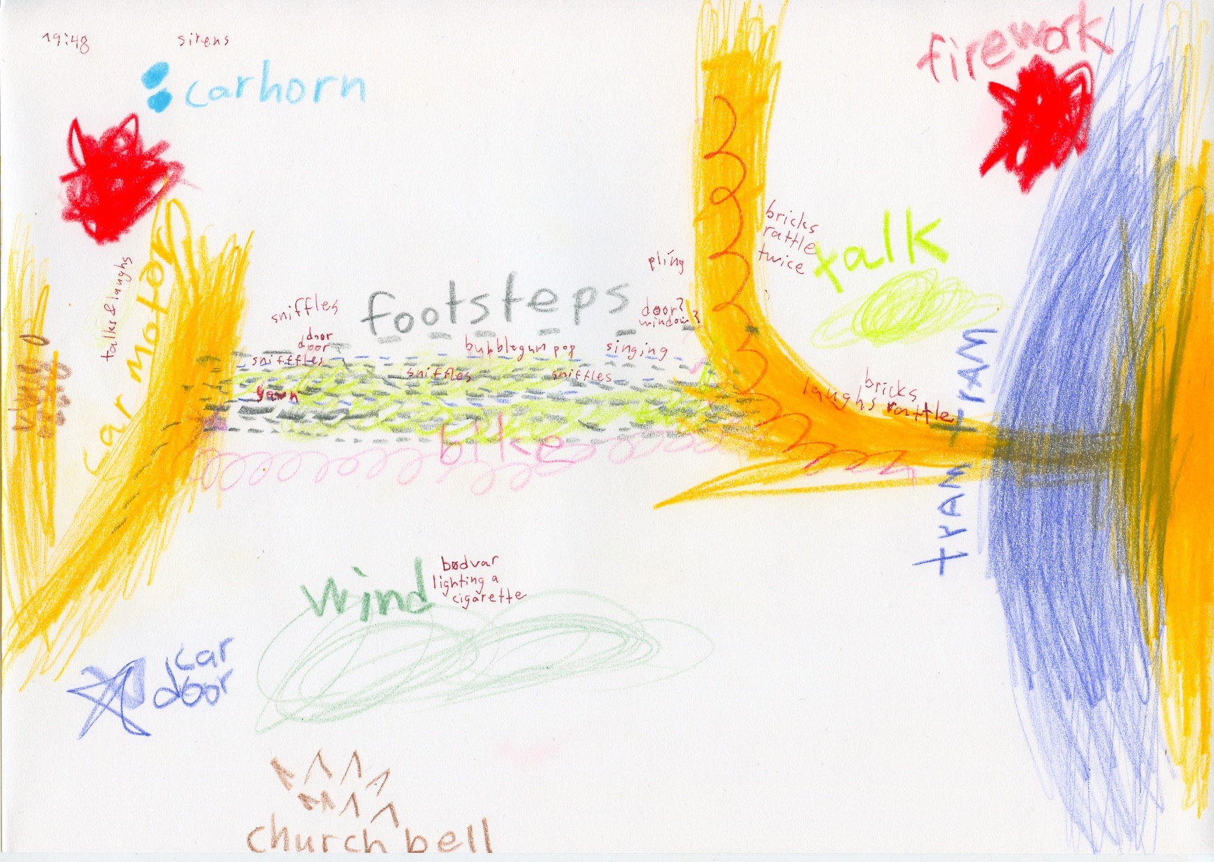 In the midst of all this passing, a person entered their balcony on the 2nd floor of the building on the east wall of the alley (which is actually the same building as I live in). This happened about 1 minute before the church bells rang 7 times. The person was smoking, and was sitting on the balcony doing so until the very moment I decided to leave the alley, at which point they also decided to go in.
