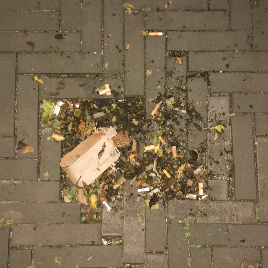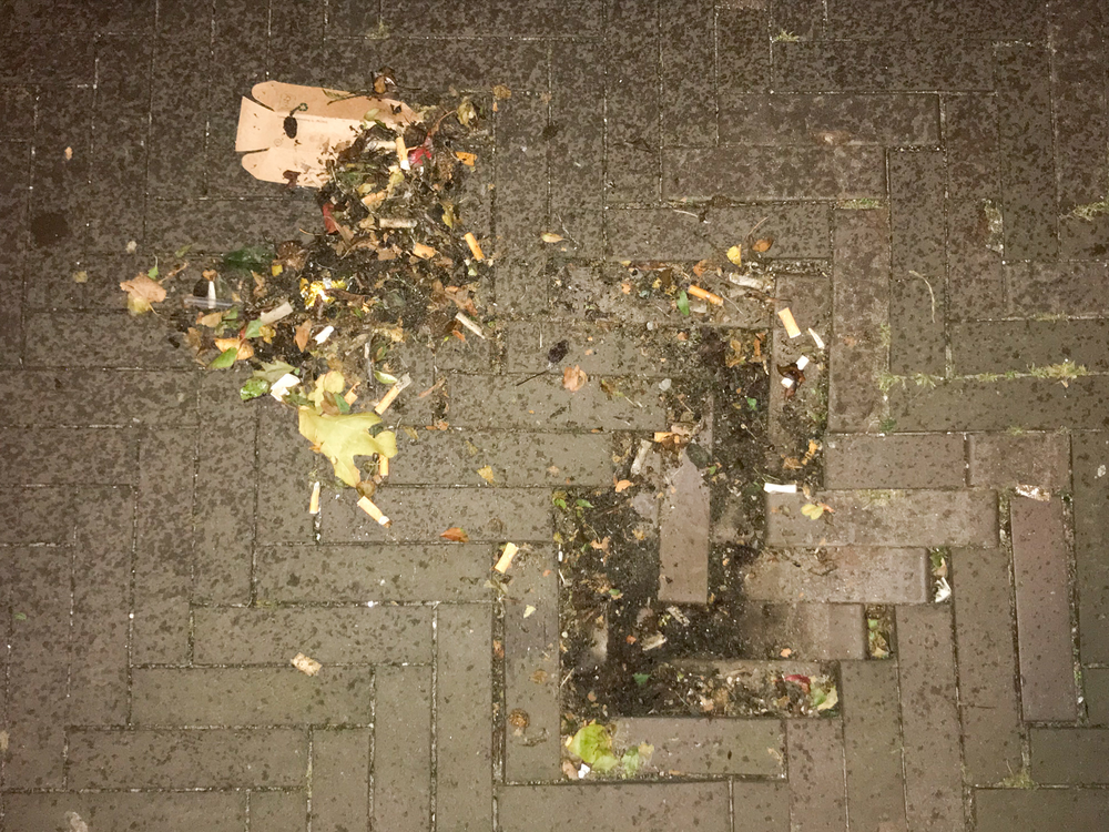 i found this hole in the alley, where trash and dead leaves end up. it seems the ground just sunk beneath the bricks, creating a dent in the ground.