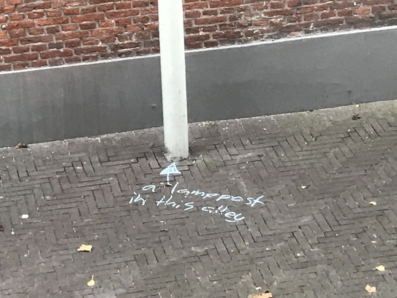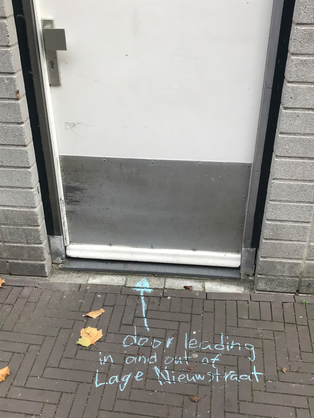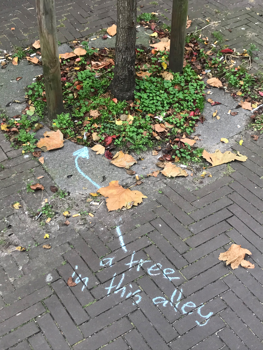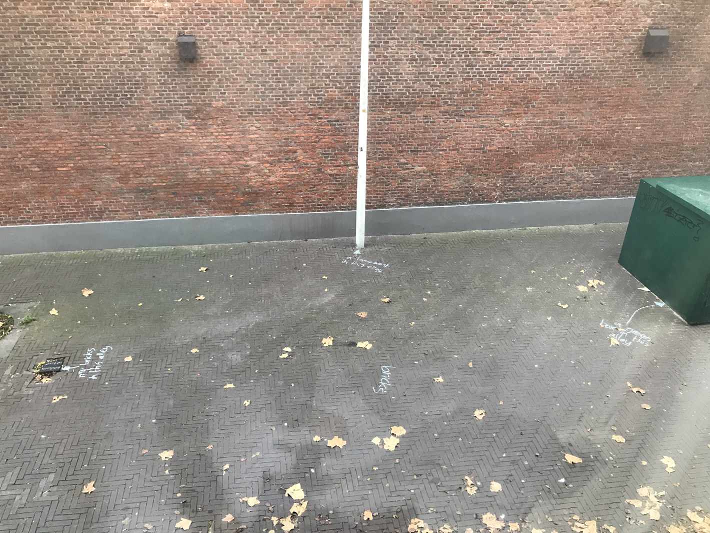 Since it’s autumn some dead leaves laid on the brick floor of the alley. They were mostly laying in the angle in between the alley brick floor and the wall of my building, but one was laying just in the middle of it. On closer inspection, I noted that over 90% of those leaves were from a maple tree, which does not exist in the alley. I later found that there are four maple trees growing outside the entrance of the hospital entrance in warmoezierstraat, and my guess is that the leaves in the alley come from there. The pear trees in the alley are still green, although they have lost their green summertime, photosynthetic prime time glow.