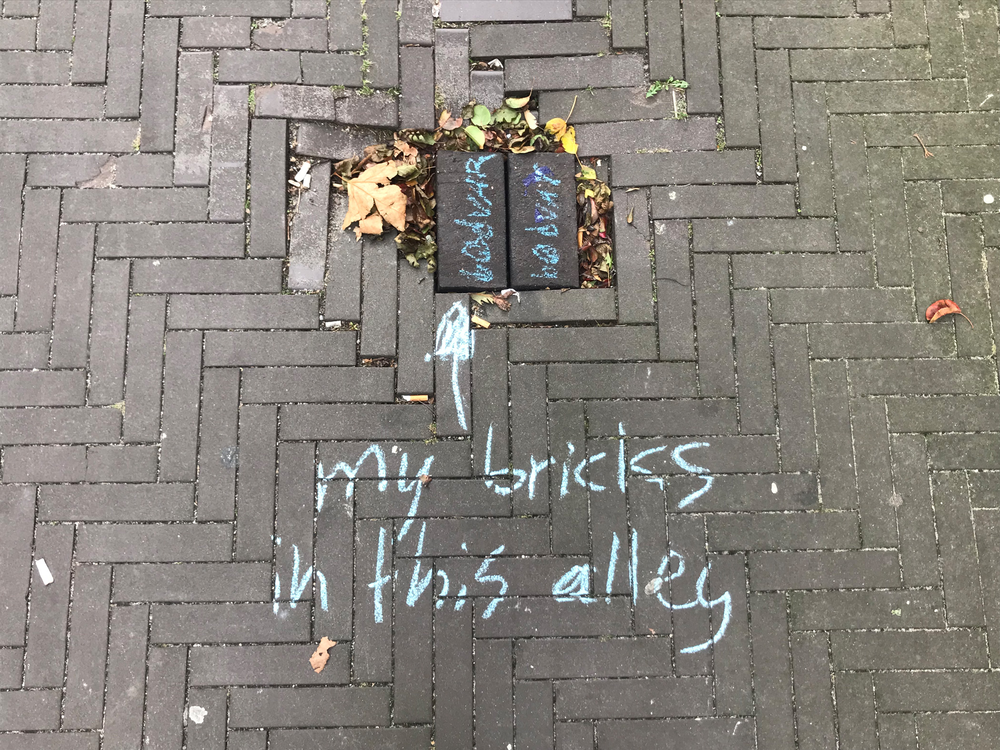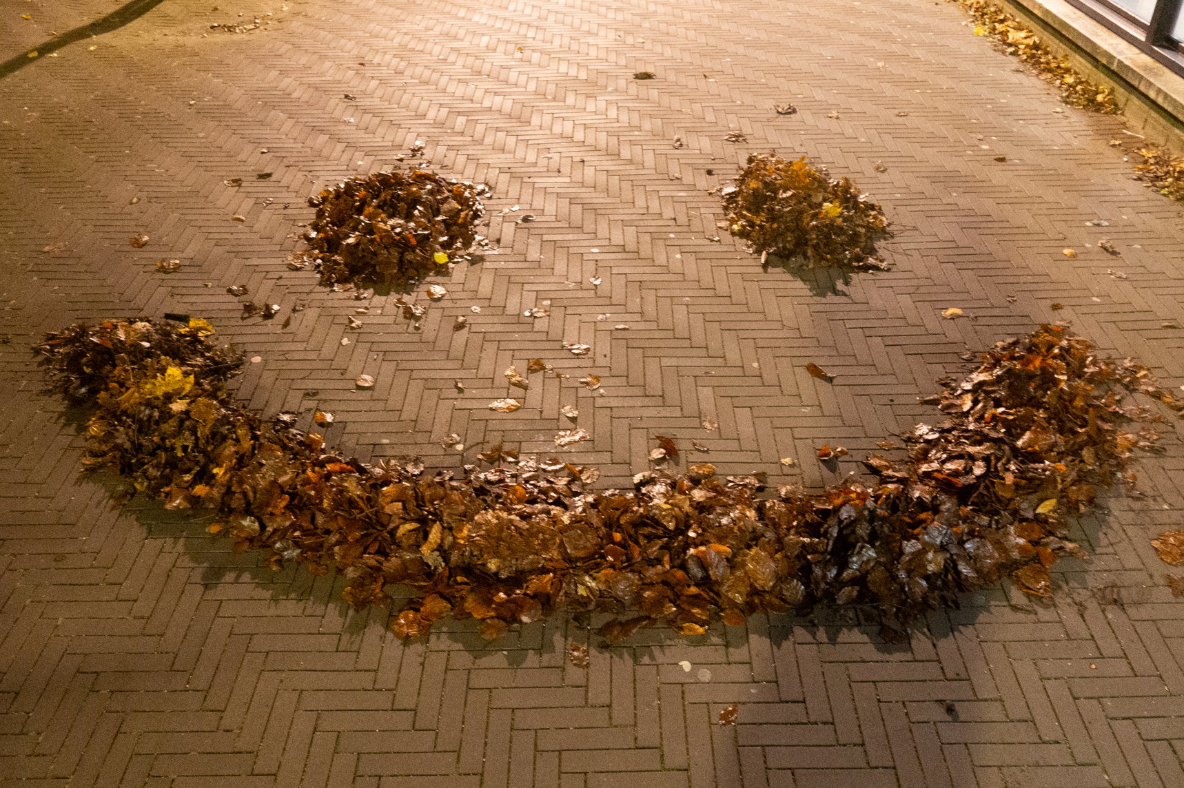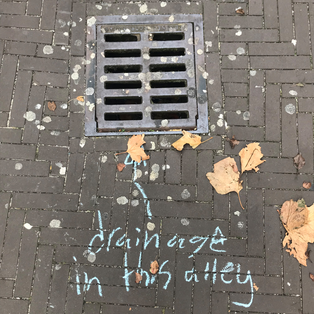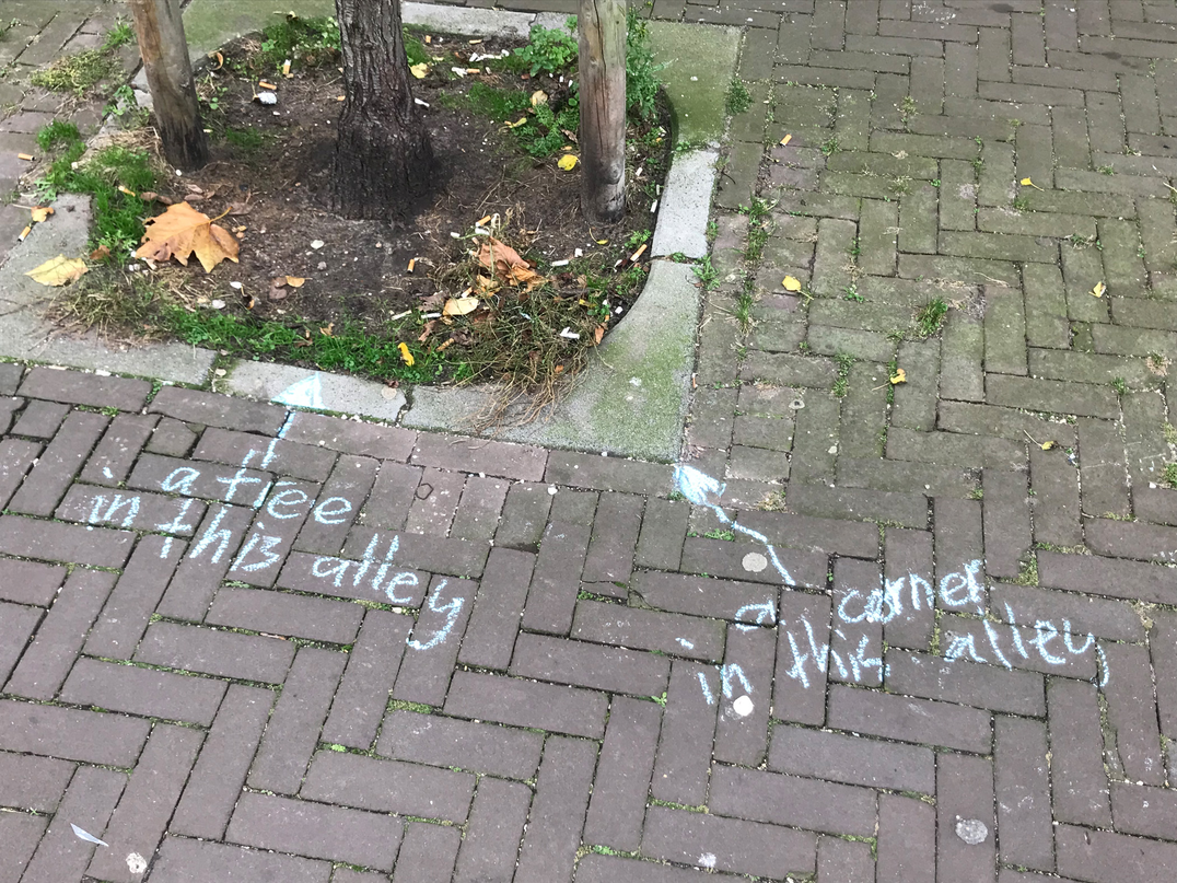 Since it’s autumn some dead leaves laid on the brick floor of the alley. They were mostly laying in the angle in between the alley brick floor and the wall of my building, but one was laying just in the middle of it. On closer inspection, I noted that over 90% of those leaves were from a maple tree, which does not exist in the alley. I later found that there are four maple trees growing outside the entrance of the hospital entrance in warmoezierstraat, and my guess is that the leaves in the alley come from there. The pear trees in the alley are still green, although they have lost their green summertime, photosynthetic prime time glow.