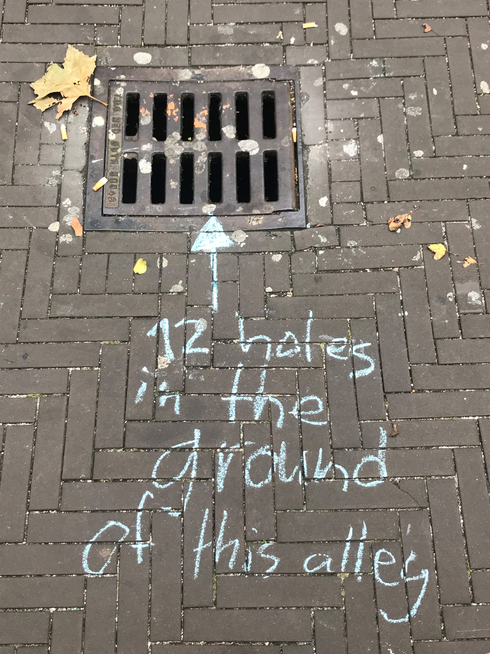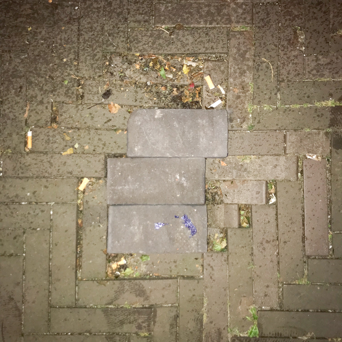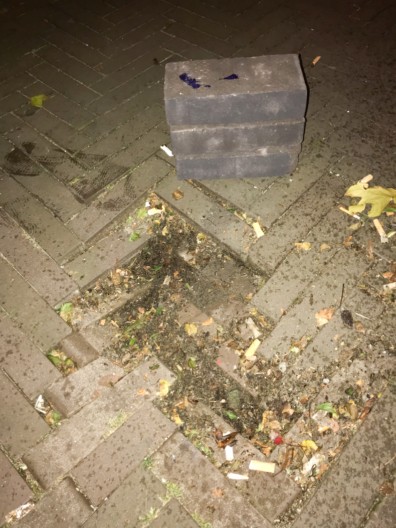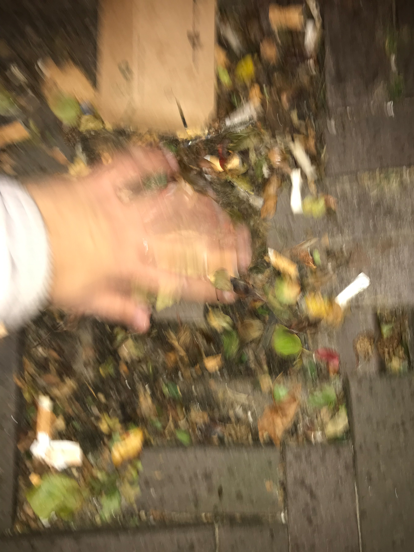 i found this hole in the alley, where trash and dead leaves end up. it seems the ground just sunk beneath the bricks, creating a dent in the ground.