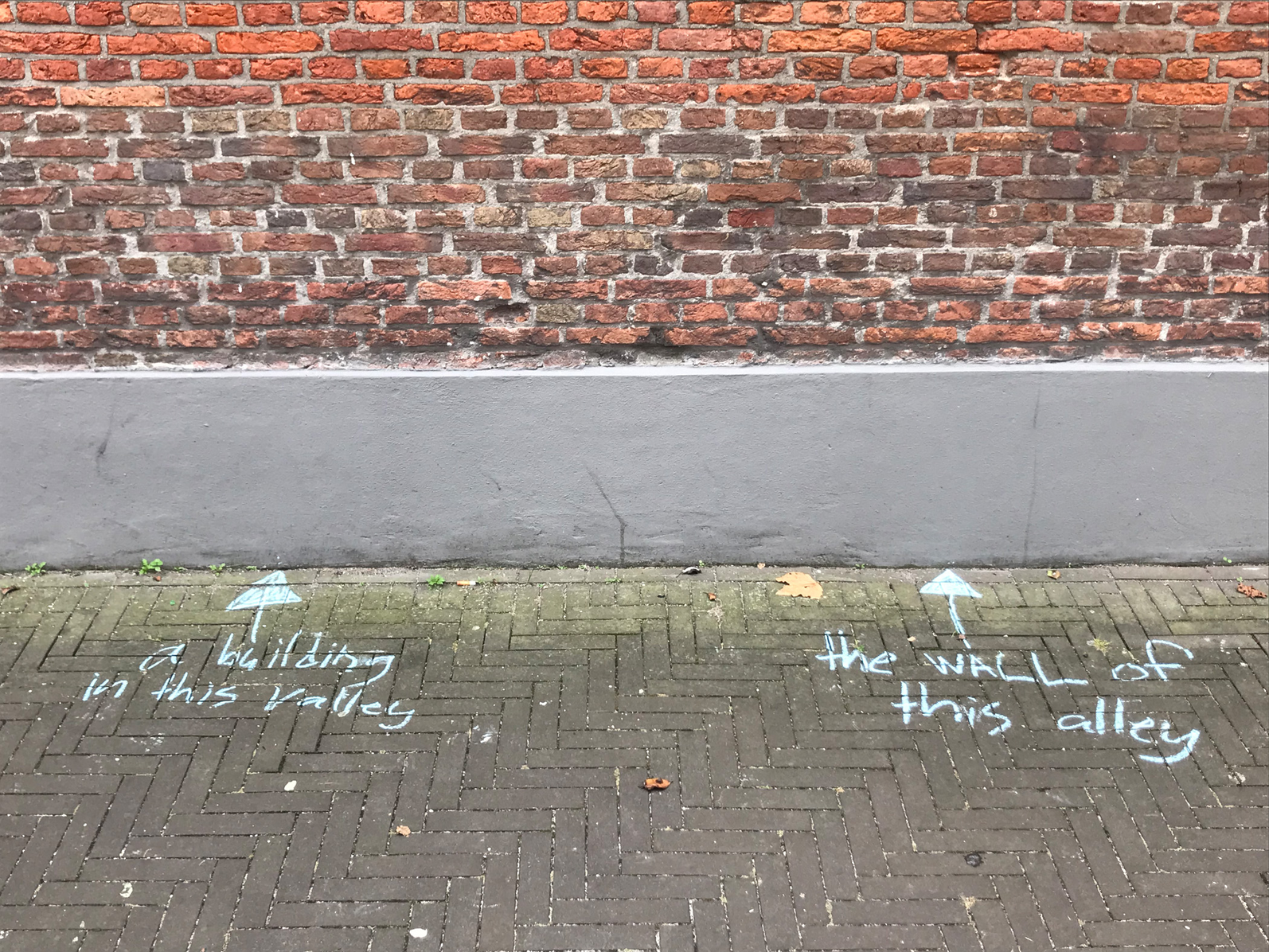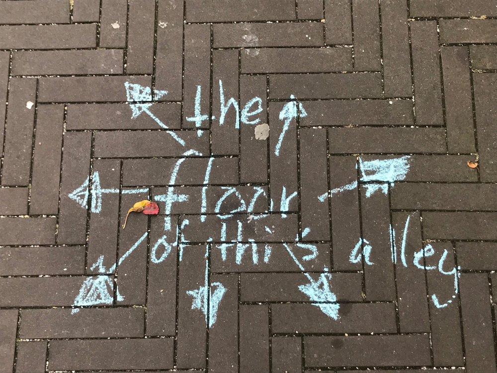 the brick floor of the alley provides a grid, like a math book.
