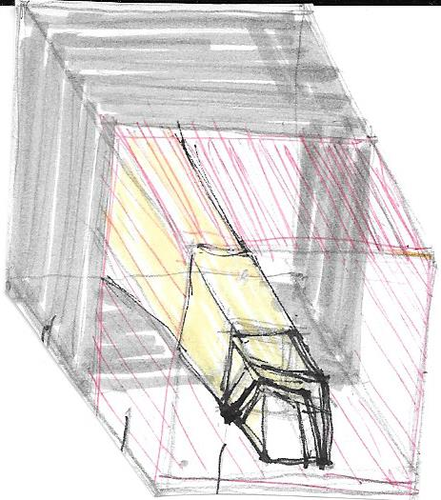 My inspiration for the use of the parallactic view was Richard Serra's sculptural work. Discussing Serra's sculpture, Rosalind Krauss comments that his work opposes "the minimalist conception of space, which positioned both viewer and sculpture like chess figures in a geometrically defined field, one moving around the other: