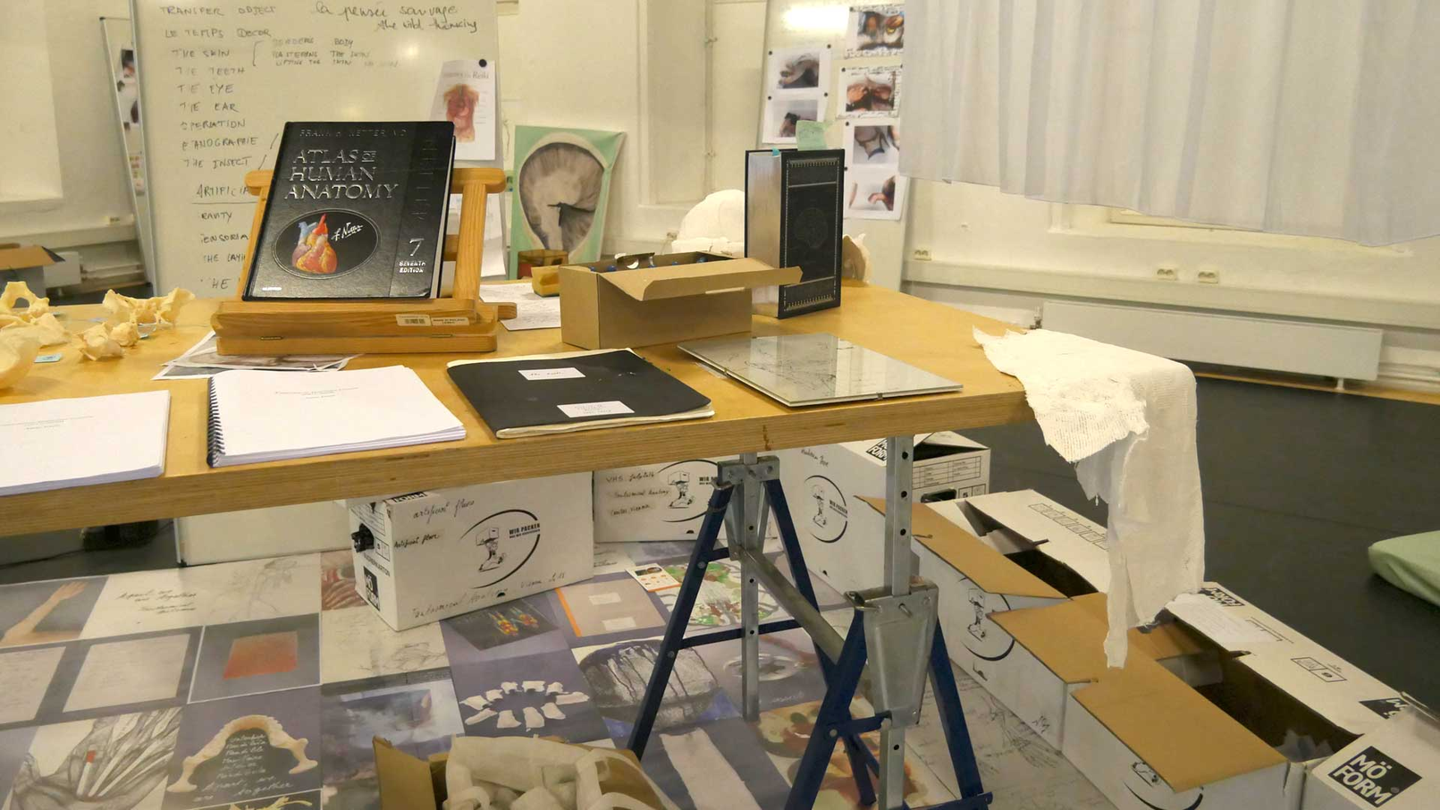 – A working table with the notebooks, books and scans used for the Atlas of Fantasmical Anatomies