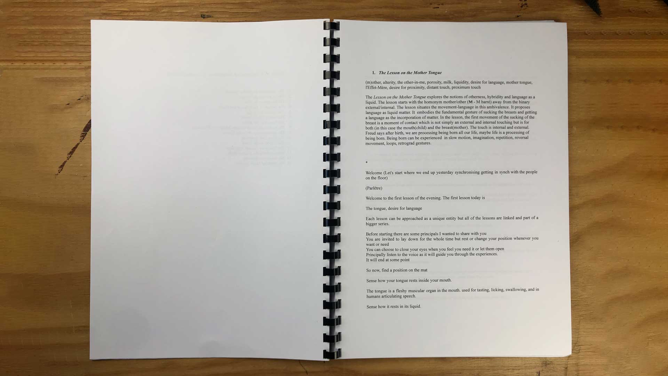 A lesson is a cut, it has a beginning and an end. It offers itself to be repeated, re-encountered, and re-visited, knowing that it will never be the same. A lesson invokes the desire of repetition and variation. An open repetition, considering that a strict repetition is inherently impossible as the lesson is affected by many factors (the space, the presences in the room, the context, the environment, the improvised moments, the modulation of my voice, unexpected interruptions, etc).
