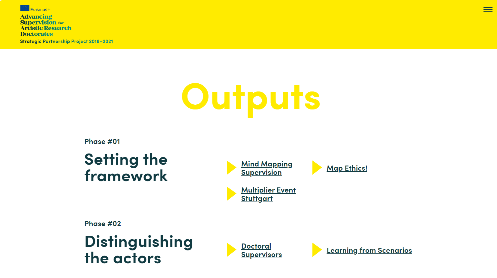 A number of tools and resources have been developed to support supervisors in artistic research through this international collaboration project. The tools and resources are relevant also for research fellows, aslo when it comes to ethics. The project´s web page contains an easy to navigate overview of the output.
