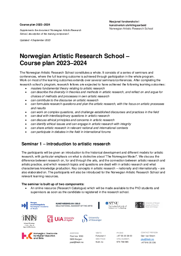 The seminar is about ethics in artistic research and artistic practice. It provides an introduction to basic research ethics and ethics in the arts, as well as methods for mapping ethical dimensions of artistic research. Various ethical challenges and potentials are discussed based on the research fellows’ projects.