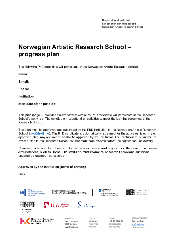 You will be asked to set up a progress plan showing when you are going to attend the mandatory seminars and Artistic Research Forums. Your institution must approve the progress plan and submit the plan to the research school's administration.