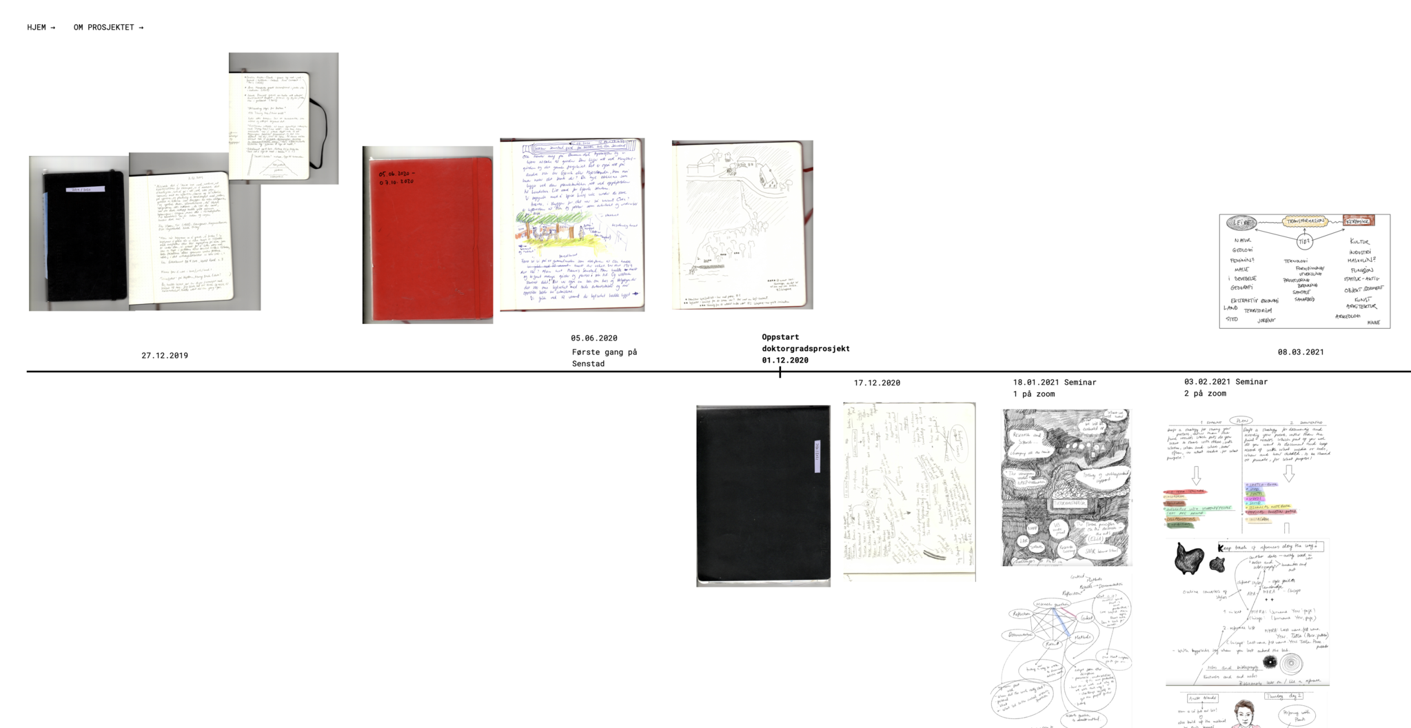 One way to keep an ongoing account of one's reflections during artistic processes, is to keep a journal or a process diary. Some artistic research projects brings this form of diary into their final reflection. This can be in the form of subjective observations or more prosaic notes, that act as driver or supplement for in-depth analysis or work creation. Sometimes the inclusion of a timeline can also be a way to structure the presentation of an artistic research process, here again a form of diary is employed as narrative tool. The sketching, note taking or field recording is inherrent in most artistic practises and can be lifted from personal use into a reflexive sharing. Finally, some artistic researchers choose to let their process diary unfold in an open access version developing alongside their research project, sharing processes and thoughts openly underway.