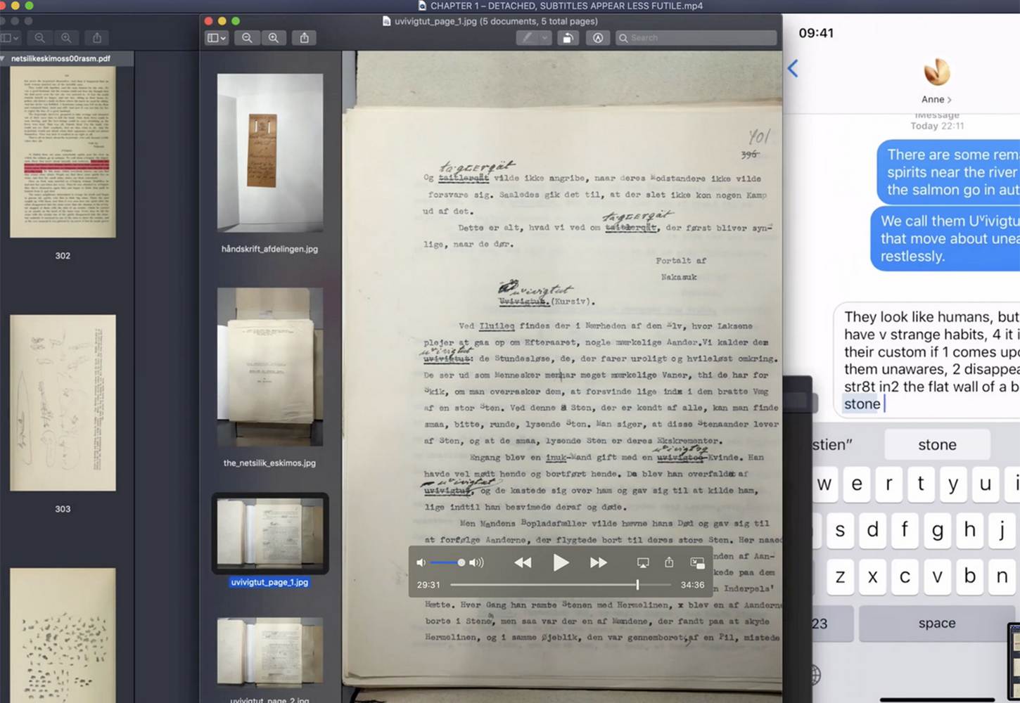 "In the way I have used transrealism as a methodology, it moves away from being merely a narrative tool and rather becomes a process of letting the narratively speculative merge with a speculative approach to materiality and aesthetics, ie. the treatment of temporality and time, as well as the forming of aesthetic audio visual formations. There is a certain performativity connected to this form of practice, wherein the speculative process of getting to a certain result is performed in the result itself and in its dialogue with a potential viewer. (...) The transrealist approach is used as a methodology for this research project, not only in the development of new artistic work but also in its reflective work. As methodology the transrealist approach has allowed for a certain fluidness in the way that reflections have unfolded parallel to practice." (2024)