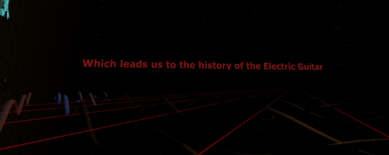 When the second figure is approached a similar process occurs, again the avatar rotates around its axis and the text which leads us to the history of the electric guitar occurs. Again a filtered cloud of granulated sounds is heard that sweeps upwards before fading out. A special visual element that occurs in this stage are a series of additional strings in wave-forms that are 'entangled around the six strings. Together, they form a sort of weaving pattern.