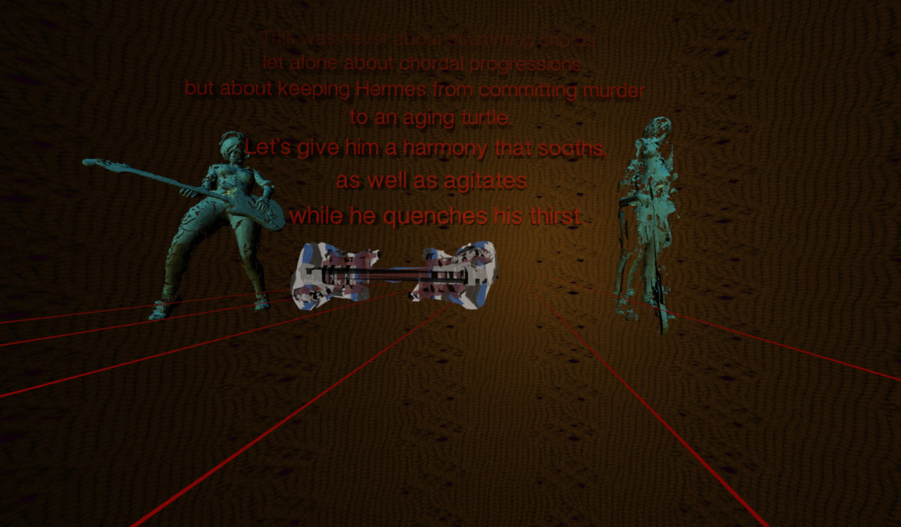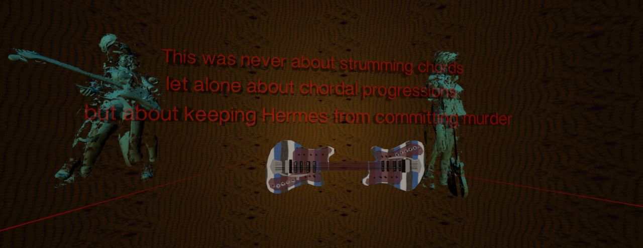 After arriving on a landing page a penetrating sound is audible at 50Hz, typical of a hum of an electric guitar. Once the landing page is clicked on it fades out and the pitch unfolds to a harmony which is timbrally modulated. The first object that the user encounters in the virtual space is an object called the 'siamese guitar', which consists of two guitar bodies that are sharing the same neck.