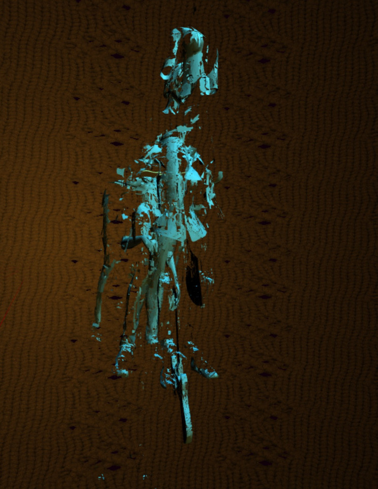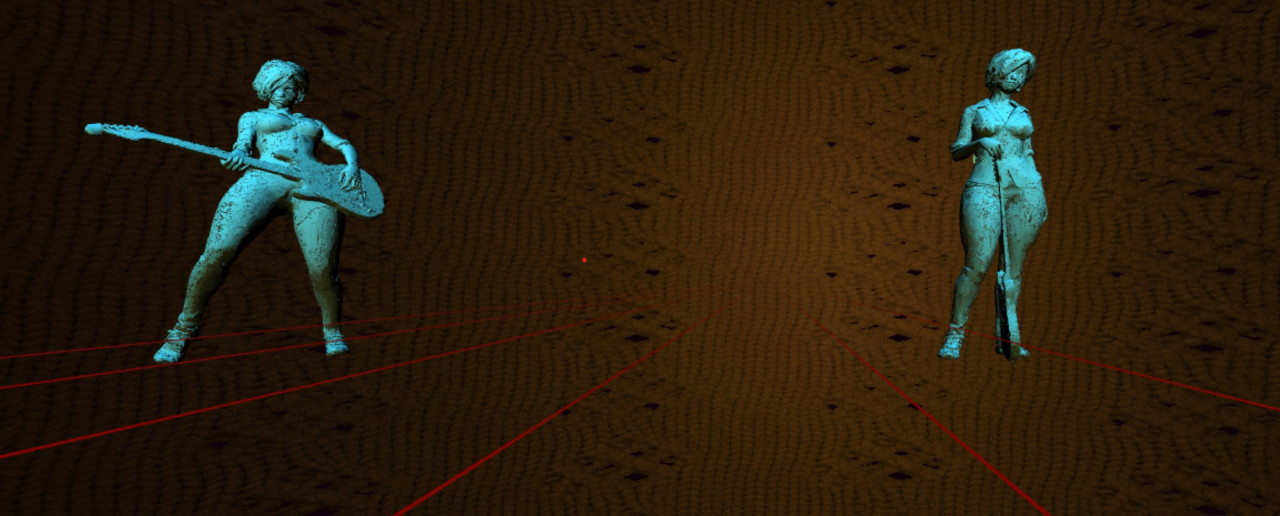 In the back area of the virtual space two statute-like figures are displayed. Once the 'siamese-guitar' disappeared, they can be approached. The six 'strings' that span through the entire space, create a visual trajectory towards them, which is supposed to encourage the user to get closer and to explore them.