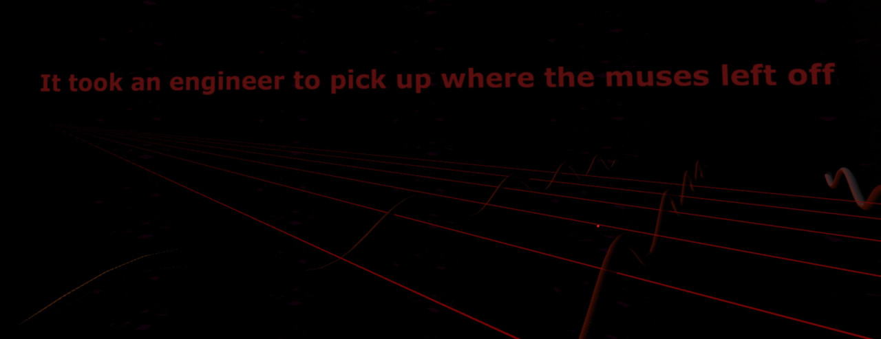 While at a distance, the figures are complete but the closer the user approaches them, the more they desintegrate. When they are approached very closely, a trigger zone is entered that takes over the navigation of the avatar. It rotates around its axis and towards the next line of text that occures in the distance and that sais: It took an engineer to pick up where the muses left off.