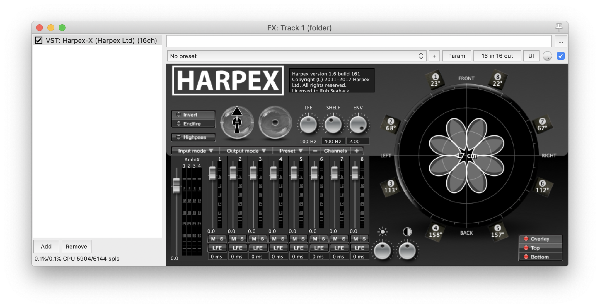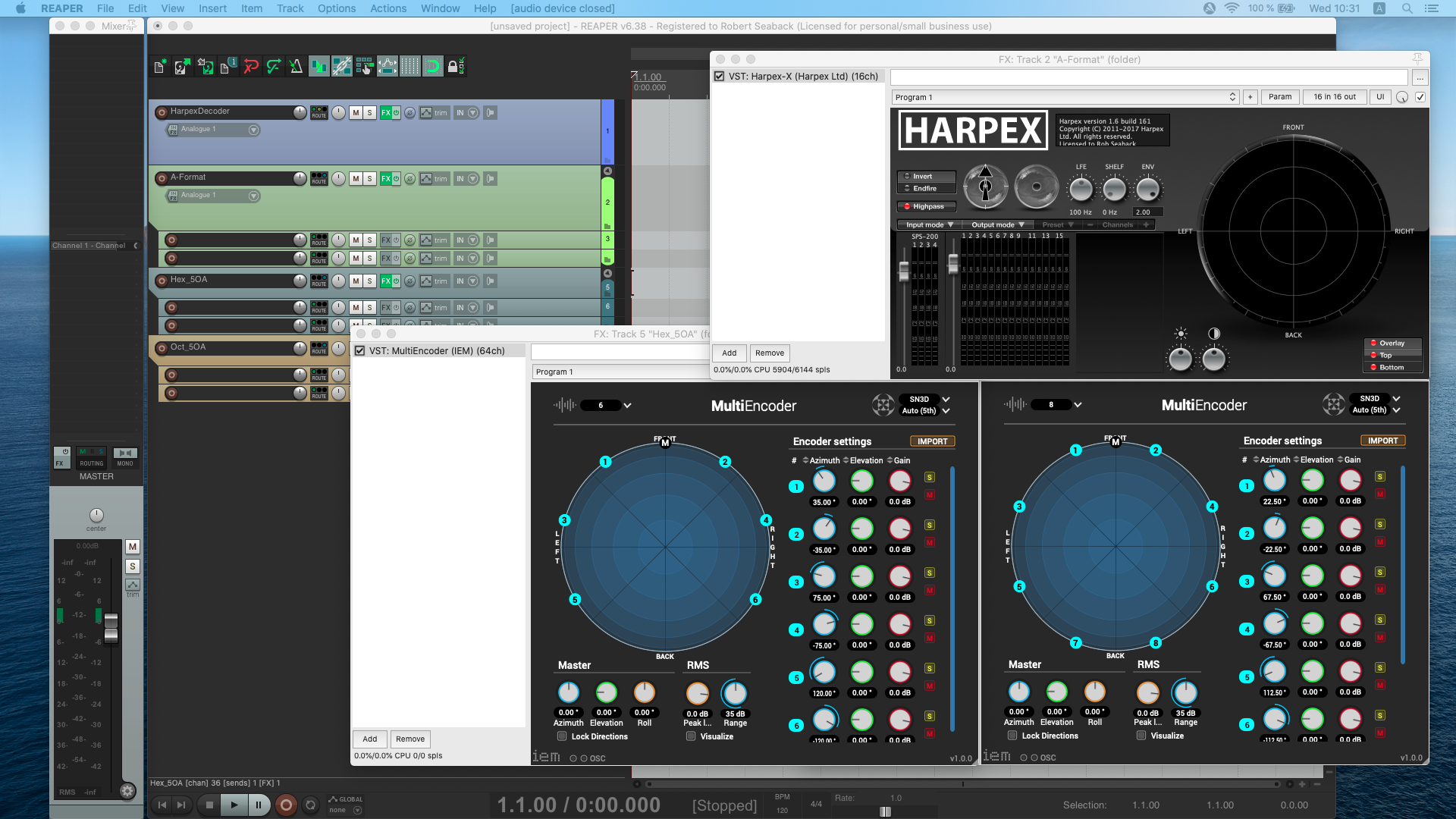 Despite these setbacks, ambisonic technologies have been implemented at production (recording) and post-production (mixing/editing) stages of Embodied/Encoded research. In the latter case, Reaper was the chosen DAW. Reaper supports up to 64 channels per track, enabling ambisonic resolution up to the 7th order (7OA, etc.). Working primarily in quadrophonic or 7.1 channel studio spaces, I preserved high ambisonic resolution at the encoding stage while monitoring (decoding) in FOA, made possible by the VST plugin Harpex. Harpex is a specialized decoder which reconciles destructive effects of low order ambisonics over standard loudspeaker configurations. The plugin uses psychoacoustic filters (active matrixing) which allows “far greater channel separation than what is possible with passive matrixing,” with minimal phasing and a larger ‘sweet spot.’28