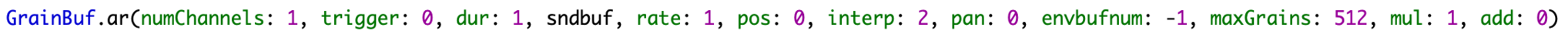 It is more traditional to slice audio according to technical or logical specifications which are not predicated on analysis of the input. At a small enough time-scale, these techniques are described by Roads as microsound, encompassing a broad range of time and frequency-domain processes.31 One example used in Embodied/Encoded is granular synthesis, which was coded in SuperCollider according to two different methods underscoring the diverse ways ‘grains’ can be constructed and addressed. In the first, I used the GrainBuf UGen to construct granular streams from a soundfile with audio rate precision, but with limited access to individual grain parameters. This was used primarily for synchronous granular synthesis, in which grain frequency is periodic, imposing modulable formant peaks onto sources. Example 3.1 demonstrates synchronous granular as a kind of time-stretching, incrementally ‘scrubbing’ through the drum kit source at close to audio-rate with overlapping grains.
