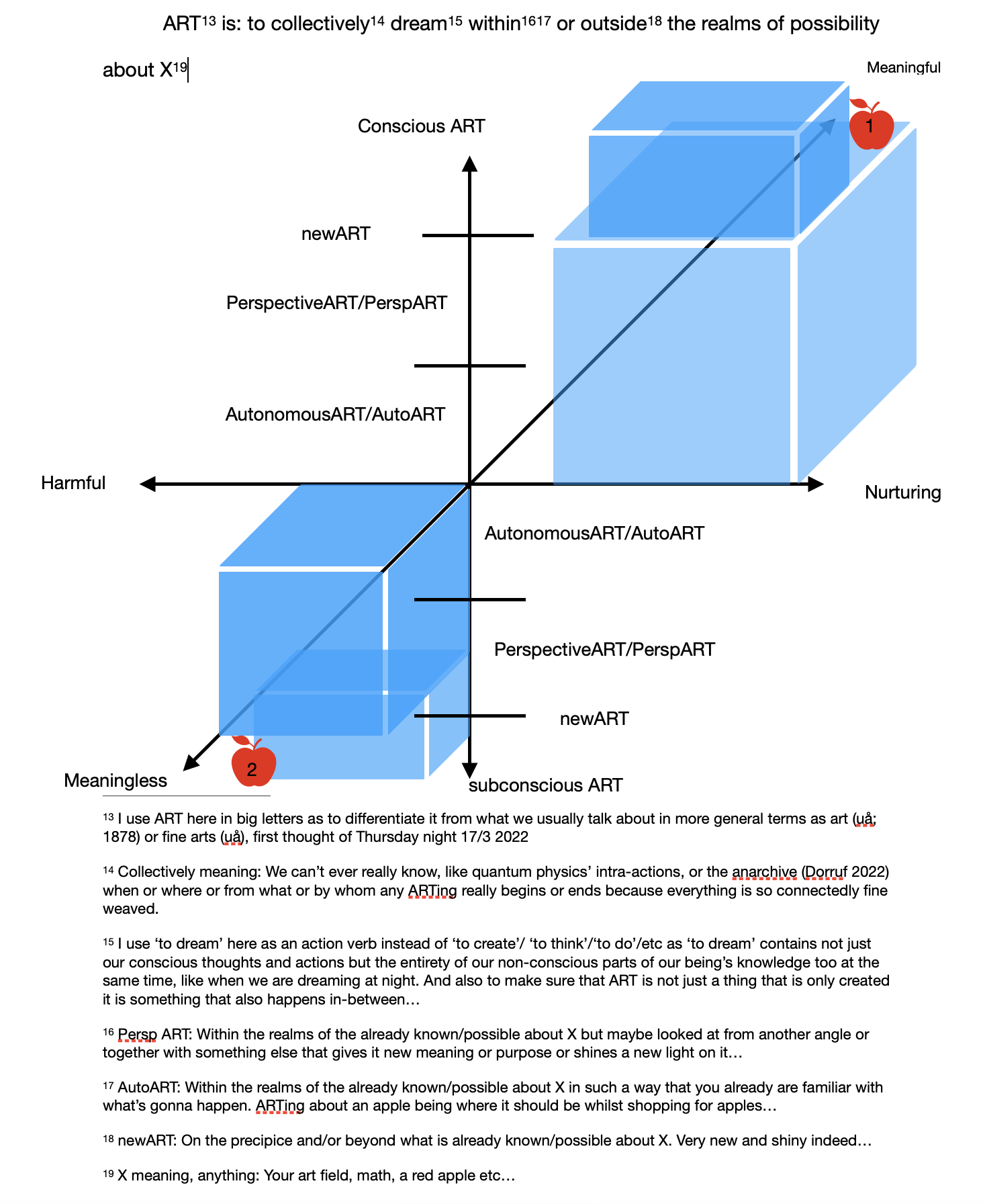 The thought of "A piece of newART and/or PerspART and/or AutoART" as "a piece of ART" that is always under construction in our minds and bodys not just at an individual but on a societal and world level until it stops being ART all together and becomes complete reality or a tool of measurment (for science or every day life)... Is fascenating to me, not just because it makes us as humans a product of our ancestors and our own ART-limitations but also in what we choose not to ART about or give the credit of ARTing to...
