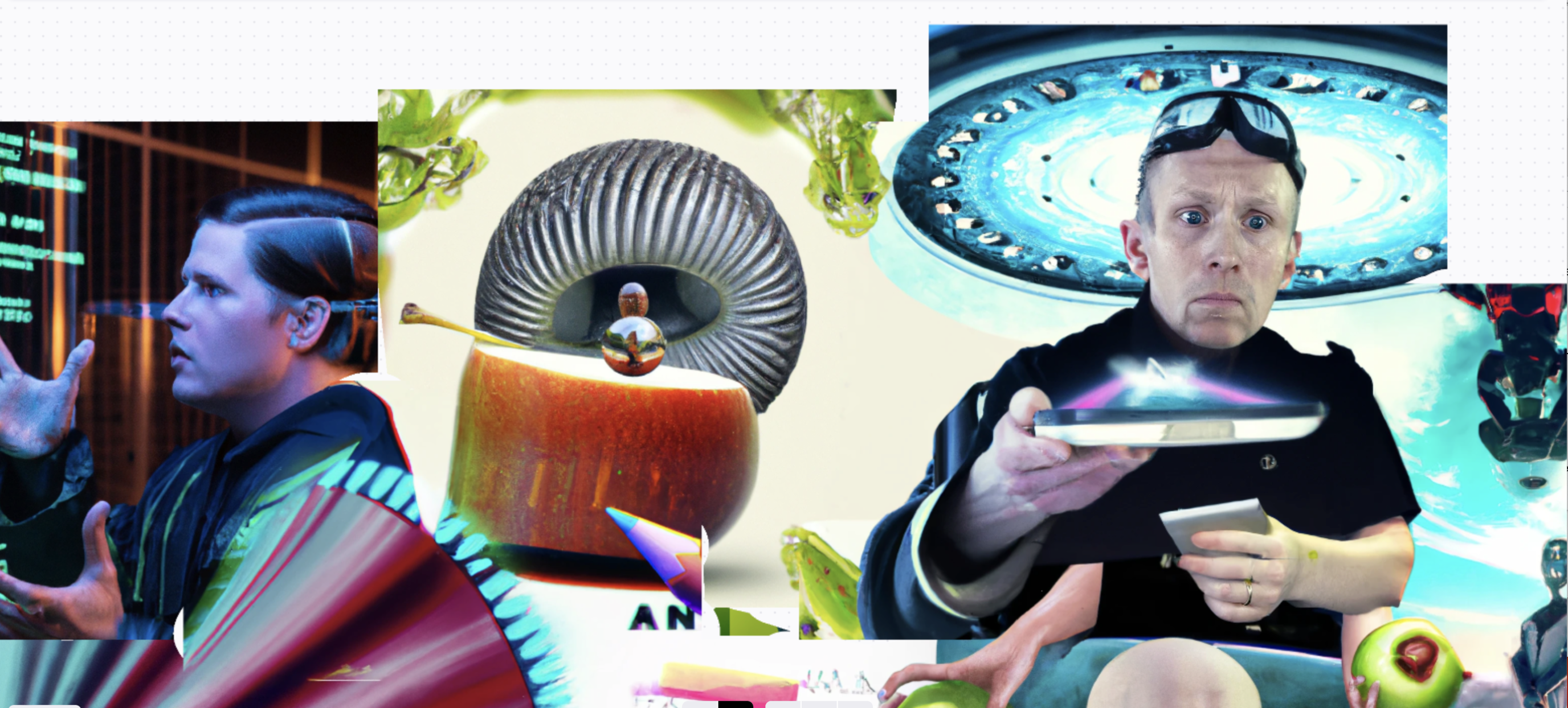 one of the prompts used was: DALL·E 2023-04-28 00.45.58 - art explained as a metaphor using a red apple where the conscious art is equally fed by the subconscious art and as collectively dreaming beyond the edge of what is possible about...