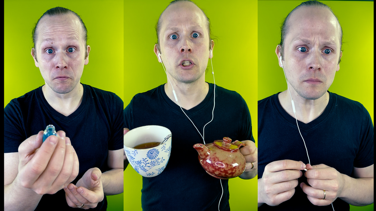 1) mime acting (relation to placing and holding the props and also pointing at myself...)