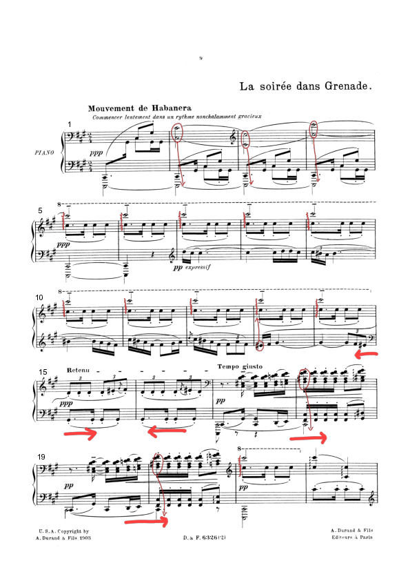 At the beginning of the piece, Viñes establishes the habanera rhythm. Although not quite as brisk as in the Albéniz Tango-piece, it has a slightly rushed pace to it. Despite this, there is some flexibility in the timing of the rhythmic character, where the slower bars are slightly restrained, whereas the faster ones are closer to the “double-dotted” tendency I found in the Albéniz Tango-piece. Viñes quickly releases the C sharp octaves in the beginning from the keys and creates the legato sound through a rich use of the sustain pedal. It is very interesting to observe that these octaves are not “arpeggiated” in bars 2-4, but constantly “arpeggiated” in bars 5-14. This once more supports my claim that Viñes is using “arpeggiation” to emphasize the polyphony in chords/intervals which consist of independent voices. Thus, he clearly separates the habanera rhythm in the upper middle voice from the high C sharp notes. The melody in the left hand from bar 7-14 has a very dominant character which includes a subtle use of rubato. Through his polyphonic playing, Viñes separates the three individual voices in this section not only by dynamics and articulation, but also by giving them an individual timing (“polyphonic rubato”). I have only marked the general rushing/slowing tendencies which applies to all voices in the annotated score. In the Tempo giusto section, Viñes greatly rushes from bar 17-18 and 19-20. There is also in my experience a very subtle use of “dislocation” on the first beat of these bars. In bar 21, Viñes once again uses “arpeggiation” to separate the top C sharp note from the habanera rhythm. It is interesting to observe that Debussy marked the two octaves in bar 22 with arpeggios. Could it also be Debussy’s intention to distinguish between the individual voices of the octaves? Bars 23-28 are seemingly quite straight forward, but the sonority was quite tricky to achieve. It is Viñes’s vast use of the sustain pedal that makes this section difficult to imitate. As in earlier recreations, I found that I had to stop playing the chords tenuto with the fingers and rather make brisk and accentuated attacks, so that the legato is made through the sustain pedal. In addition, the chords must be “dislocated” from the habanera rhythm to achieve the clear polyphony we hear in Viñes’s performance. From bar 38, Viñes plays very briskly and accentuated. He “arpeggiates” the chords on the first beat of bars 38-43 and then continues with the “unrolled,” “dislocated” approach.” In bars 39, 41 and 43, he does not play the second semiquaver A natural note in both hands (although in 41, he slightly "dislocates" the A’s in both hands on the second beat so that it almost sounds as if written, hence the parentheses in the annotated score). We have seen similar kind of such “re-arrangements” with Viñes before. It might be that Viñes felt that the second semiquaver (A natural) was weakening the energy achieved by the close-to-double-dotting approach on the preceding two E natural’s. It could also be a result of the hierarchy in Viñes’s playing – meaning that these notes are simply rushed in favor of the main melody. From the last chord of bar 41 and onwards, the chords in the right hand becomes polyphonic. Consequently, Viñes does not “arpeggiate” the chords, but rather “dislocates” the octave melody from the harmonic middle notes (marked in blue in the annotated score). This practice is carried on throughout bar 49. In this same section, he also omits the middle voice chord notes on the second beat of bars 45-47, although the identical notes from the first beat are more or less sustained throughout the bar by the pedal. He does however add middle-voice chord notes on the second last semiquaver octaves in bars 48 and 49. Thus, the entire section of 45-49 is executed in the same manner as bar 44. What is less so in line with this apparent consistency though, is bar 44, where Viñes plays a D natural instead of the written E natural in the habanera rhythm of the left hand. This is one of the rare cases where I suspect that Viñes does play a wrong note, because I can find no other logical explanation. In bar 50, Viñes plays in the right hand both the E natural that is the third note of the triplet and the semiquaver E natural which is doubling the habanera rhythm of the left hand. In other words, he plays two E naturals to separate the voices from each other. This is very much in line with what Ignacy Friedman is doing frequently in the Chopin Nocturne. The entire section from bar 51-58 is played with a very subtle “dislocation” in the right hand, so that the melody note at the bottom of the chord is very slightly dealyed. Thus, it is clearly separated from the accompaniment in the sonority. In 59, we see an example of a downwards arpeggio, probably to make the habanera rhythm delayed from the high C sharp. In bar 60, Viñes shifts into “arpeggiating” in a typical upwards manner. Bars 61-66 are played very similar as 23-28, but now with the high C sharp on top of the habanera rhythm of the left hand in bars 62, 64 and 66. It is interesting to note that bars 64 and 66 are marked with arpeggios in the original score. In my 2006 Durand edition, bar 62 also has a marked arpeggio in parenthesis[1]. I would argue that Viñes’s practice of “arpeggiating” these octaves can be seen in relation to his “arpeggiation” in bars 5-14. Debussy’s arpeggio indication in 64 and 66 is in relation to this very much in line with Viñes’s coherent practice of emphasizing the polyphony. Bars 67-75 is another good example of a section that is far more complex than it seems at first. I believe that Viñes is “dislocating” the chords from the bass in 67-68, but then, when the chords become polyphonic in bar 69, he starts to “dislocate” the octave melody. However, the tempo is fast, so the two practices occasionally sor