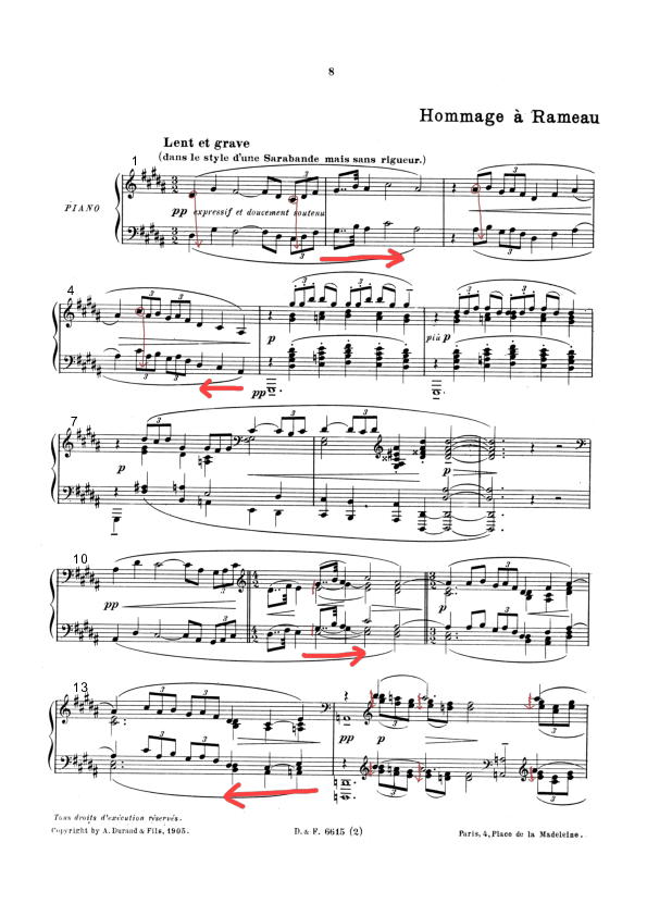 With regards to the Hommage a Rameau, bars 1-30 are missing in the recording by Viñes. The process of making this “extrapolation” started as a sort of jigsaw puzzle where several of the pieces are missing. In order to complete this in an “authentic Viñes manner,” I firstly examined the score and applied my knowledge from the earlier recreating process, looking for sections that relate to bars 31 and onwards (the part which Viñes recorded). Secondly, I looked for relatable sections in the already recreated recordings, in this case especially in the pieces of Debussy. Thirdly, it was interesting to hear Marcelle Meyer play the beginning of the piece and to (carefully) use this as a sort of inspiration in the extrapolation process. As discussed earlier, her recording does have some striking similarities with Viñes's, but it is very important to be clear on what she does differently. As stated earlier, she does not have the general “forward moving” tempo of Viñes and tends to slow down at the end of several phrases, as opposed to the longer “sweeps” of Viñes.