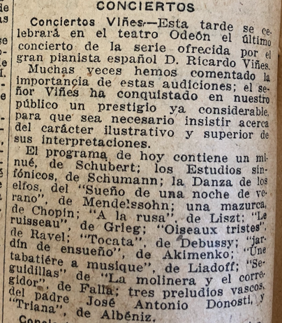 Part of this review states that: “We have discussed the importance of these recitals many times. Mr. Viñes has already won considerable prestige in our audience, so that it is necessary to insist on the illustrative and superior character of his interpretations.”[17]