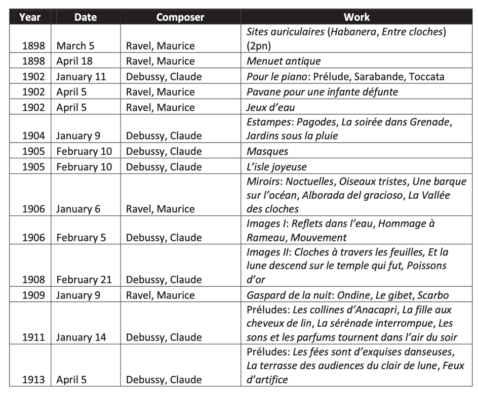 Ricardo Viñes’s memory was perhaps his most important talent as a pianist, and this enabled him to acquire an extraordinarily extensive piano repertoire, which he showcased throughout his vast concert career. Despite his extensive touring in England, Switzerland, Germany, Italy, Belgium, Holland, Portugal, South America and Spain, Viñes was first and foremost a pianist of Paris and France most of his life. In addition to his numerous solo recitals, Viñes collaborated with orchestras and gave chamber music concerts. His ability to rapidly learn new music, combined with his virtuosic technique, made it natural for Viñes to champion contemporary repertoires. Among the composers whose work Viñes premiered we find Manuel de Falla, Erik Satie, Joaquín Turina, Florent Schmitt, Henry Février and Gabriel Fauré.[8] He also took great effort in introducing Russian as well as South American works to French audiences. However, it is first and foremost through his numerous world premieres of the piano works by Claude Debussy and Maurice Ravel that he made his most important mark. In his dissertation, Ricardo Viñes and Les Apaches, Matthew G. Goodrich presents a thorough overview of the complete works by Ravel and Debussy which were premiered by Viñes: