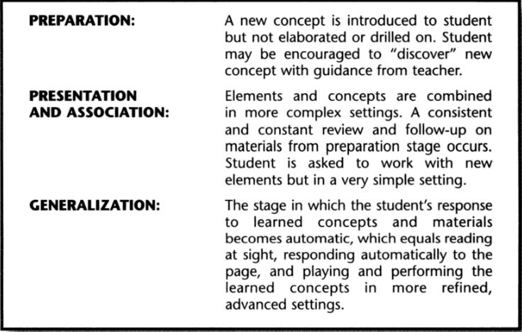 As relation to what these steps contribute to de music lessons, Baker-Jorden writes that in preparation, repetition is key and that a new element in the lesson should be presented at least four times before you ask the student to work with it. In the second step, the new learned information is integrated in new material, at a very low level. Lastly, in generalization, the student gets more familiar with the new element and is able to use it as part of its musical toolbox.