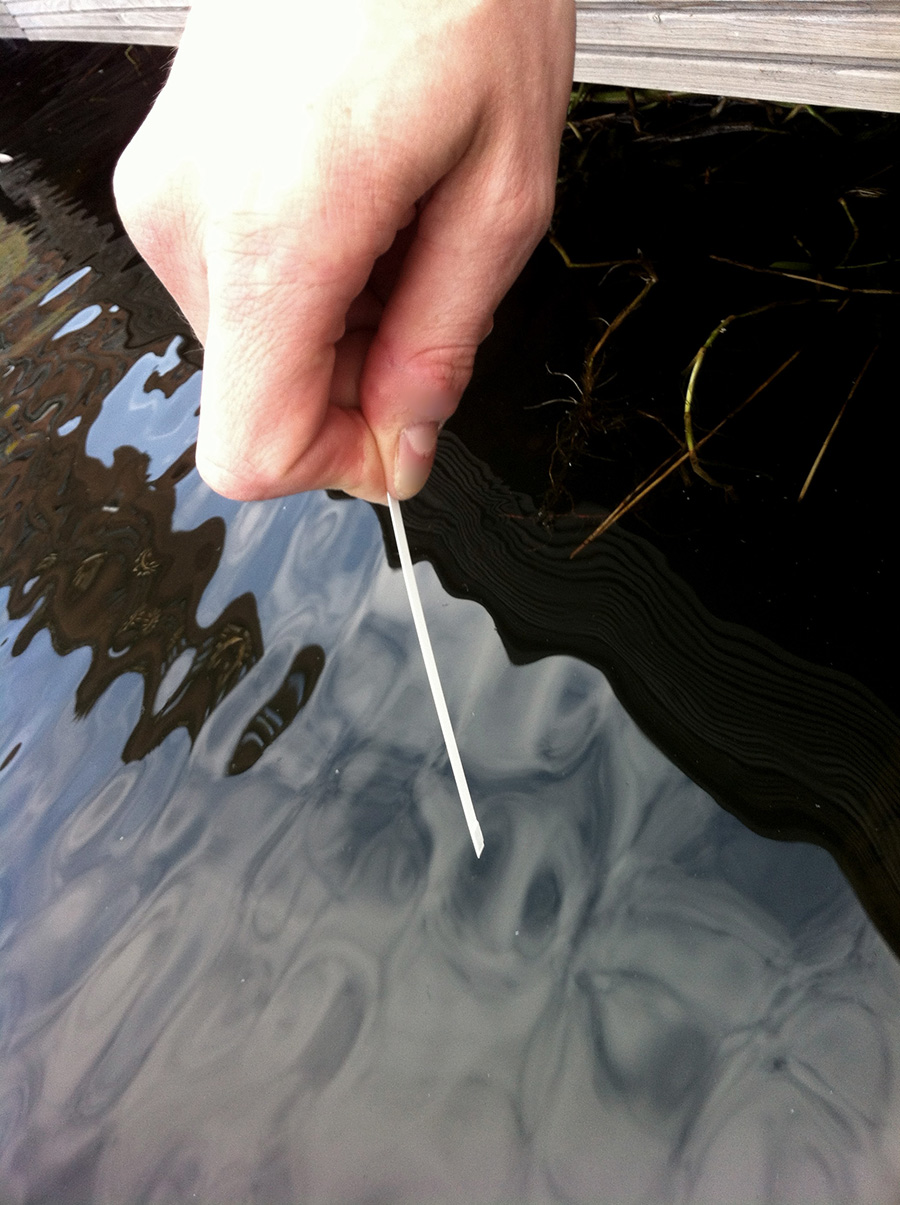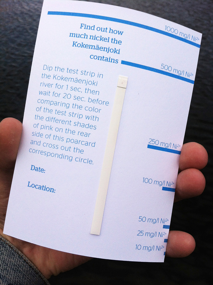 "Find out how much nickel the Kokemäenjoki contains dip the test strip in the river for 1 sec, then wait for 20 sec. before comparing the color of the test strip with the different shades of pink on the rear side of this poarcard and cross out the corresponding circle"