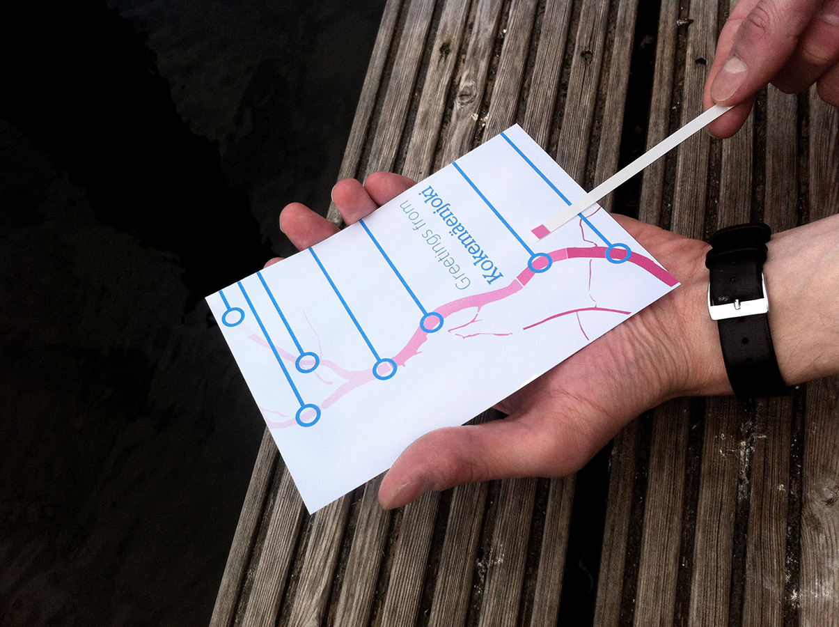 The nickel contamination can be measured with a nickel rapid test strip which is fixed on the rear side of the postcard. The test person can mark the location and the date of the nickel test – later on an online database is an interesting expansion to the concept, offering an overview of the water quality over time.