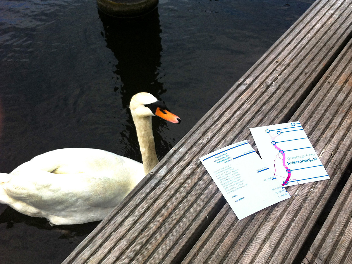 As a result, a postcard can help to control the water quality. Even if most of the nickel has been flushed away to the Baltic sea and the oceans, it is a valuation for the close relation which connects the people with their river Kokemäenjoki. The postcard is meant to be distributed in Pori. It is printed on both sides, the front displaying a map of the Kokemäenjoki in the part where it passes Pori in different shades of pink, the rear side explaining the various shades of pink from the front with the amount of nickel in the water.