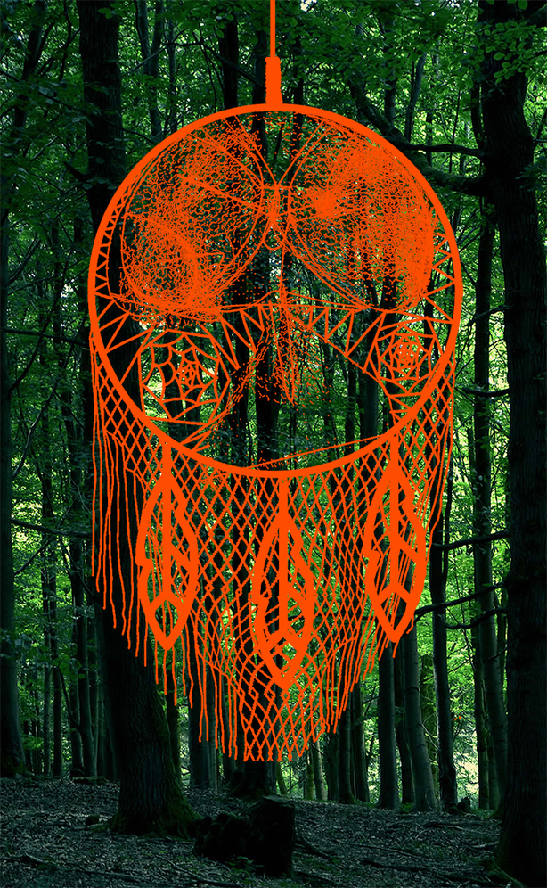 In order to use the trap as a part of the artefact, it first had to be cleaned and flattened. Because of the weight of the trap and its large size, I could not follow my original plan to hand it below the main circle of the dreamcatcher, but had instead to use the trap as the central element. This compromise had an upside: the silhouette of the trap reminded a stingray or a jelly fish and was easily associated with water. To finalise the object, I added the net and some stylised feathers, and chose a bright orange colour to make it appear brighter among the trees.