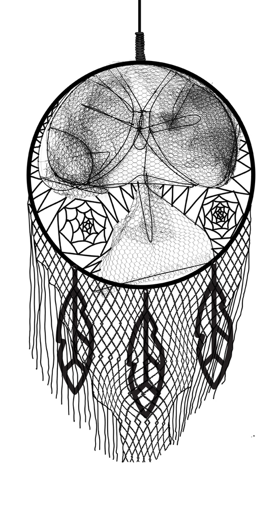 The resulting array of images displayed beautiful metal structures of different shapes and sizes. They looked as though specially designed as art objects and I decided to incorporate one or several of them into the dream catcher. On one hand, that would allow me to establish associations with the fish, and on the other hand, distance from the direct copying of the native-american artefact. On this stage I could create a first sketch of the artefact and embed it into the landscape.