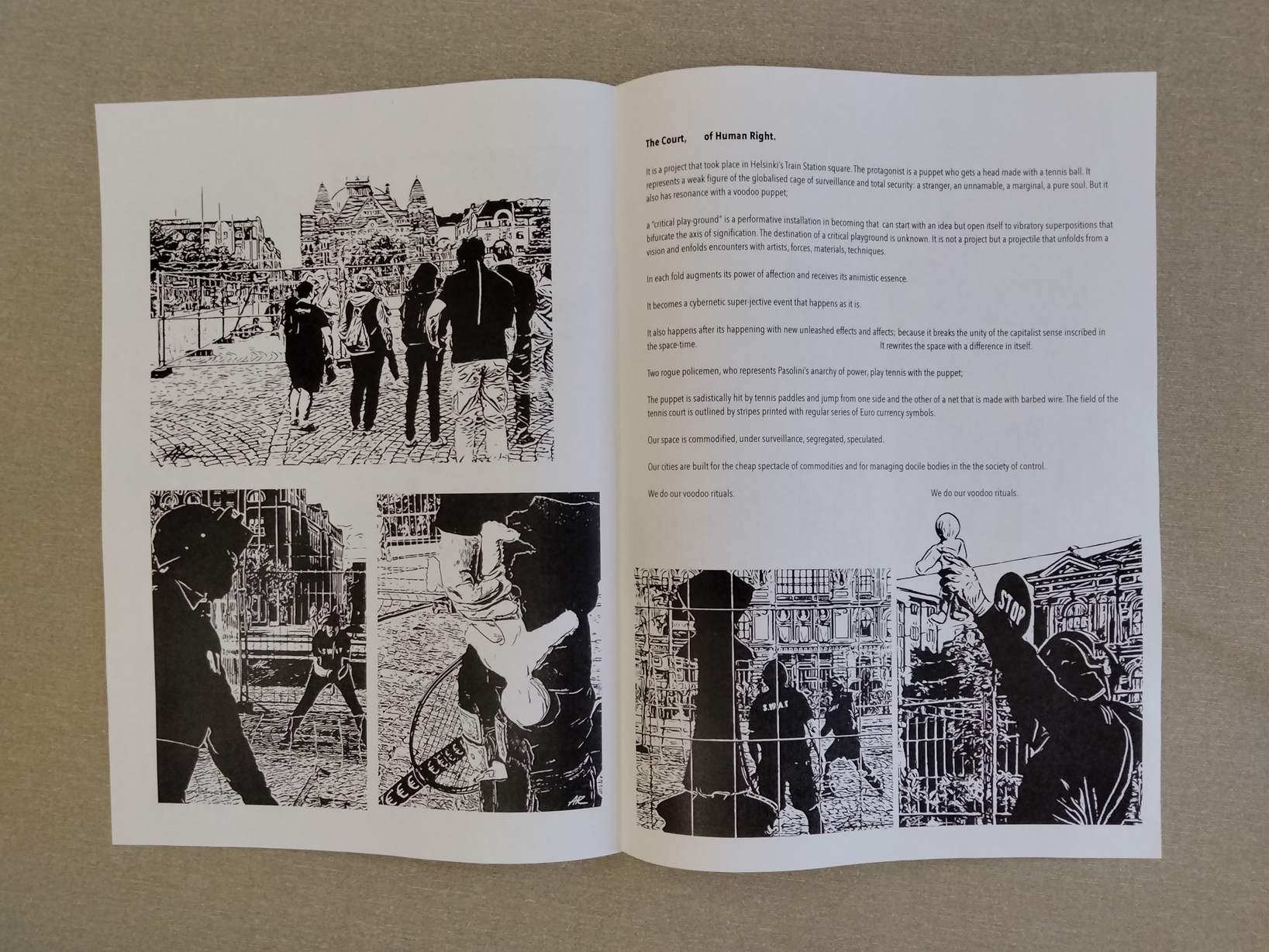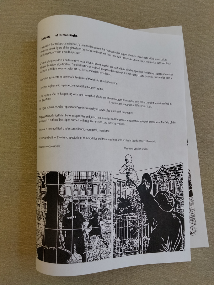 For what concerns my example of "graphic novel clandestine press” I will show images elaborated by my last critical playground the “Court, of Human Rights.” Here the Court is a “tennis court” where two policemen play sadistically with a weak subject (a puppet with a tennis-ball head)…The puppet can represent a stranger, a soul, an exiled, an unnamable stranger…but also a voodoo puppet …) The text of the clandestine newspaper will be short, in a way academic, but with the lyric style of the art manifesto. Otherwise it loses the feature of artworks and does not fit with the “graphic novel” style. One must find a mediating language that is proper to the scope of a new medium and its use. The intervention “The Court, of Human Rights” is conceived, produced, installed and performed by the artists Gian Luigi Biagini and John Dunn but photographed and elaborated by the artist Arja Reiman. The “graphic novel clandestine press” is an idea by Gian Luigi Biagini but the Anartist assemblage, that is a singular but pluralist assemblage, is to start a becoming and enfolding encounters as potentialities. The subject of the doing becomes a desiring super-jective Event that acquires its animistic power into an “objectile” (Deleuze, 1992) in becoming. Here is a wave of black magic that works in the process; we are only witches and shamans that follows-creates the “immanentation” of a “spirit”. Each of my installation-performance is like the emerging of a temple for an inhuman divine-demonic presence. I cannot build the temple all by myself. I need to detach a flow from the block of an inert everyday life. I need to generate a magic flow with its own life that seduces other participants and produces a collective sacred catalysis. I need to prepare the “clearing” (Heidegger, 1998) to host a “mysterious anima”. It’s a rite of possession