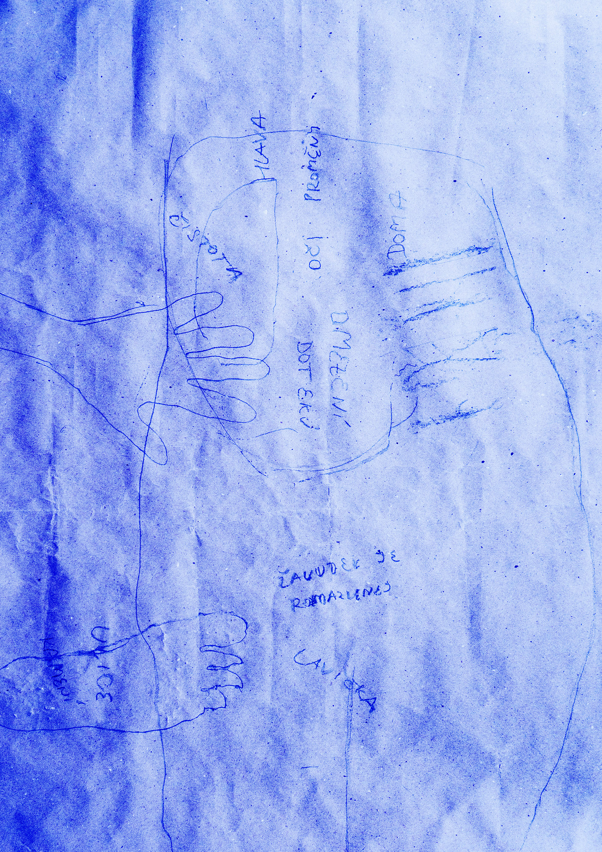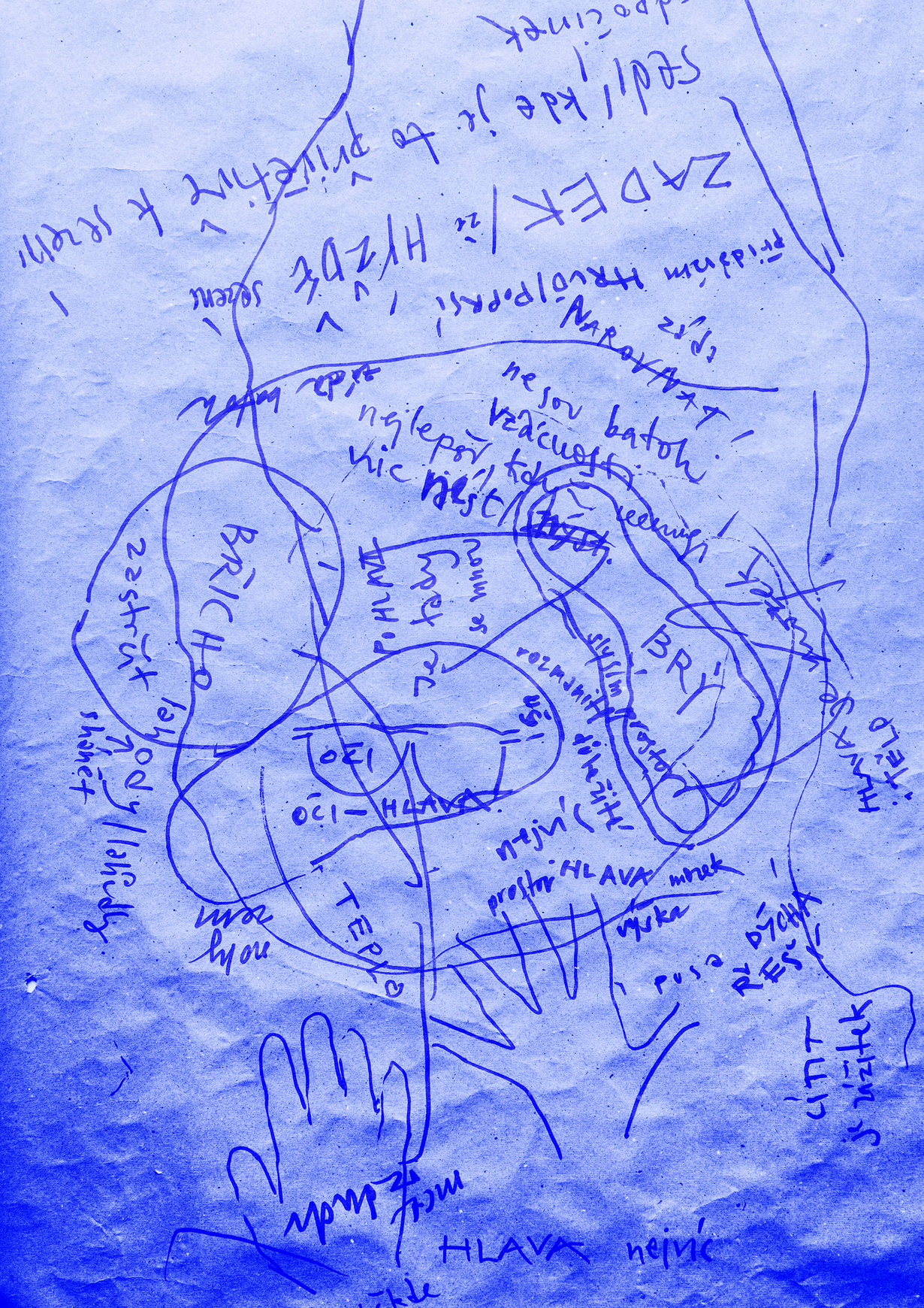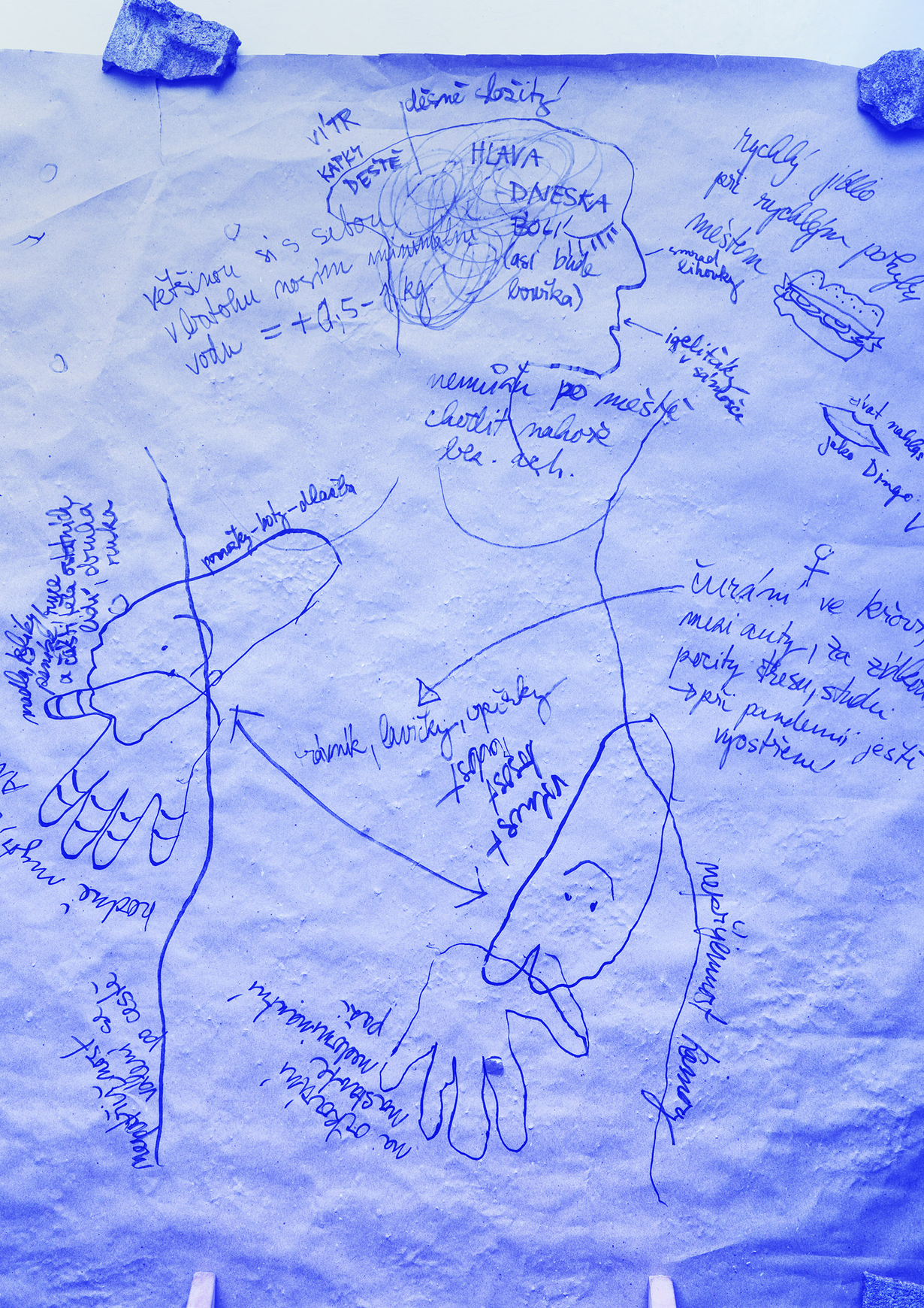 They included intimate, subjective experiences that they represented through diagrammatic sketches of their bodies. I have written the text fragments from the drawings into subjectively composed extracts to enable translation from Czech into English. See the sample: