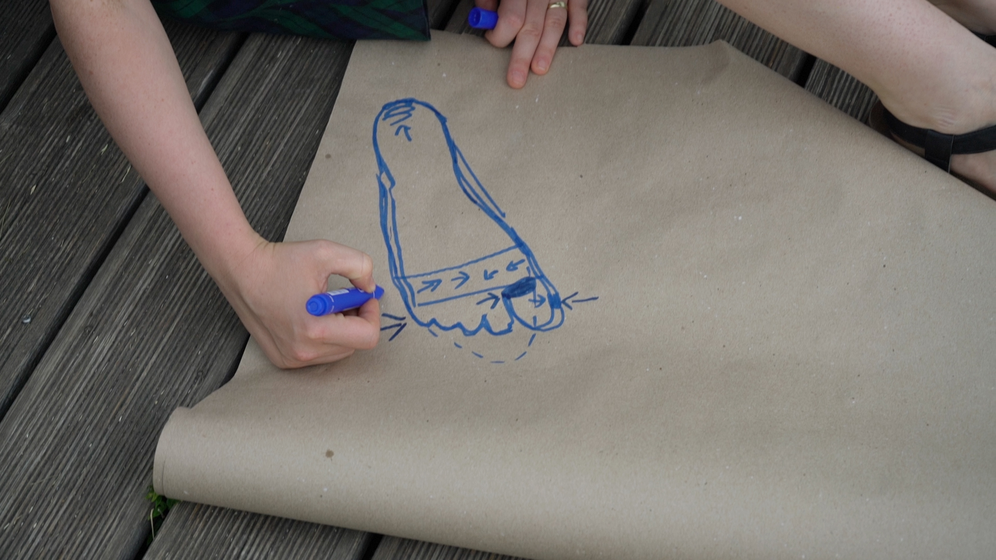 So now it's wrapping paper time, and since architecture starts from the ground up, often already underground, we also start from the ground up and draw our feet wherever you want on the paper. And you can do it with a shoe, without a shoe, both options are interesting enough. And then the foot, before it starts to rain, could somehow appear on the paper, and we could think about what each part of the foot feels like. So starting completely from the foot, from the ground, from what maybe we feel, what surface is there, or even in general, when you're in a public space, it doesn't have to be about the current moment, or it can be, it's completely up to you. Or it can be about how the foot feels without the shoe or in the shoe. The shoe is also an element, a tool of representation or some functional element, it can, I don't know, make it easier to move through the city or it can make it more difficult and we can notice all that here. I'm going to make a note here too. Then we'll draw a hand somewhere. Any fragment of a hand, but we're going to talk now at the beginning about the hand as such or with the fingers about how hands are a contact tool. They're the thing that most of our body interacts with the public space. And of course the feet, because they just touch the ground the most, and at the same time, a huge point of contact is those hands. And there can be an awful lot of feelings associated with hands. And it can be associated with the pandemic. Because over the last year, the whole society went through some huge social changes. And now we're gonna get into the torso, if you can draw it in there or if you can just portray it however you want, yeah. Maybe try to get the buttocks in there. That's a very interesting and important part of the body, too. Maybe we can start with the buttocks. What feelings might be associated with them. Maybe it's a neglected part of the body, I don't know. A lot of things in that space are designed for the buttocks too, whether in public transport, for sitting and so on, and at the same time it's also connected to that feeling I was describing a moment ago - being in plain sight, being seen - for a lot of people that can be a moment too, when a lot of people are trying to work with those buttocks, maybe in terms of clothing, somebody is trying to cover them up or somebody is trying to emphasize them, and it can be part of a lot of associations in that public space itself, the idea of just those buttocks. And at the same time the buttocks can be some kind of contact point with architecture and with the feelings associated with the objectification of one's own body, of course. And of course there are many other vital organs. I'm definitely interested in the bladder. That's such an important moment in public space where you need to resolve this situation of a filled bladder and a lot of people resolve that situation in quite different ways and it's actually quite space related - we have to go somewhere to resolve it, we have to find it, we have to be able to do it and so on, so sometimes or often, I don't know, that need can bring up a lot of spatial issues and interesting situations. And then there's also gender, gender can also have a lot of its own needs or pleasures or difficulties, or gender can also be terribly forgotten because it's not talked about so much in relation to public space and it can be a poor thing as such a taboo.