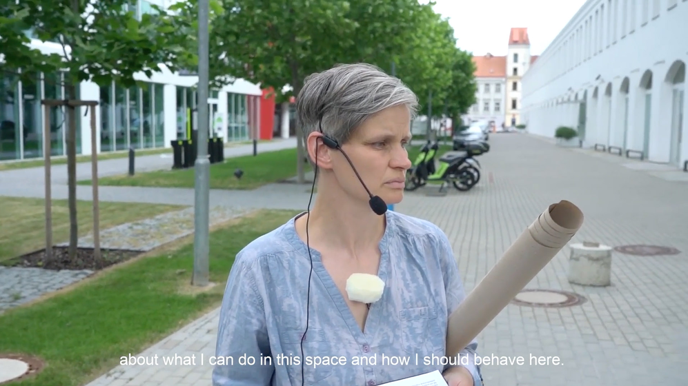 Head. There are a lot of senses on it - it's a nutritious chapter, just with the space, so of course the eyes - it's proven that 80% of perception is taken up by visuals. What can the eyes sense now or in general? What do you think about often in terms of, for example, the combination of sight, looking at that space and in terms of sort of analyzing that space. If you perceive the sounds of that city and if those sounds affect you in some way. If some of them make you uncomfortable or if some of them attract you or stimulate you, and also what all your ears might experience in the space. There may be tools or technology involved, if you use headphones for example, if headphones can be a kind of well-intentioned barrier for you from that space or the perception of it, that can be a significant moment too - headphones. The mouth is one of the gateways into the body directly and it can also be associated in public space with the pandemic, obviously with the facemask and all that, that it's hygienically just that gateway into the body, so I wonder if that's changed anything for you in the last year through the sensations of that mouth or if you want to keep it in general terms regardless of the pandemic. And about the ears. The ears can't actually be closed, unlike the mouth. And what those mouths do in the public space, whether we are all influenced by our upbringing and keep our mouths shut or whether we would like to disrupt that and maybe yawn significantly, or smack lips, or spit, or just leave our mouths open and maybe the facemask can have an effect on all of that or some of that and can bring some relief or it can be a restriction and something terribly unpleasant. And finally, it could be the brain, the last part of the body here in the workshop, an organ. That's a huge chapter of course and now if you would try to somehow compare in relation to space what is happening to you in there and what you think of as maybe the first thing that comes up in relation to your brain and space. And sort of that planning of moving around the space, navigating it, self-control, maybe even a huge self-control to actually playing a role and affirming an identity in that public space. All of that can be there.