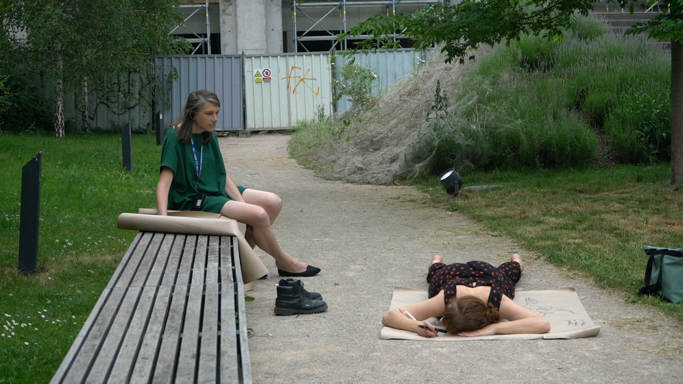 The respondents made use of the generosity of the format of wrapping paper, using the contact of their body with the paper and the foundation surface (found on-site, such as pavement surfaces, benches, grass), working with their bodies, outlining drawings, and physically and mentally making their impressions present in space and time. This disclosure took place through guided meditation, or an attempt to engage the associations connected to individual body parts or organs in the perception of the environment and to enable, through this connection, a step out of the otherwise stereotypical frameworks of thinking about being in space.
