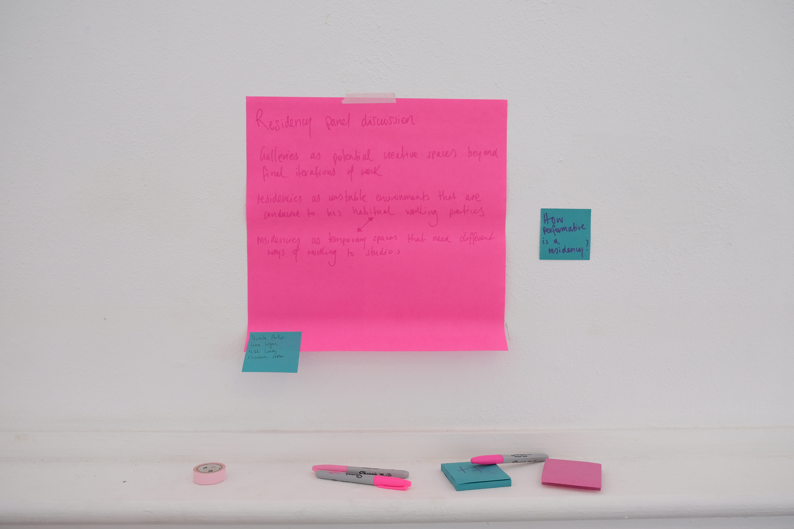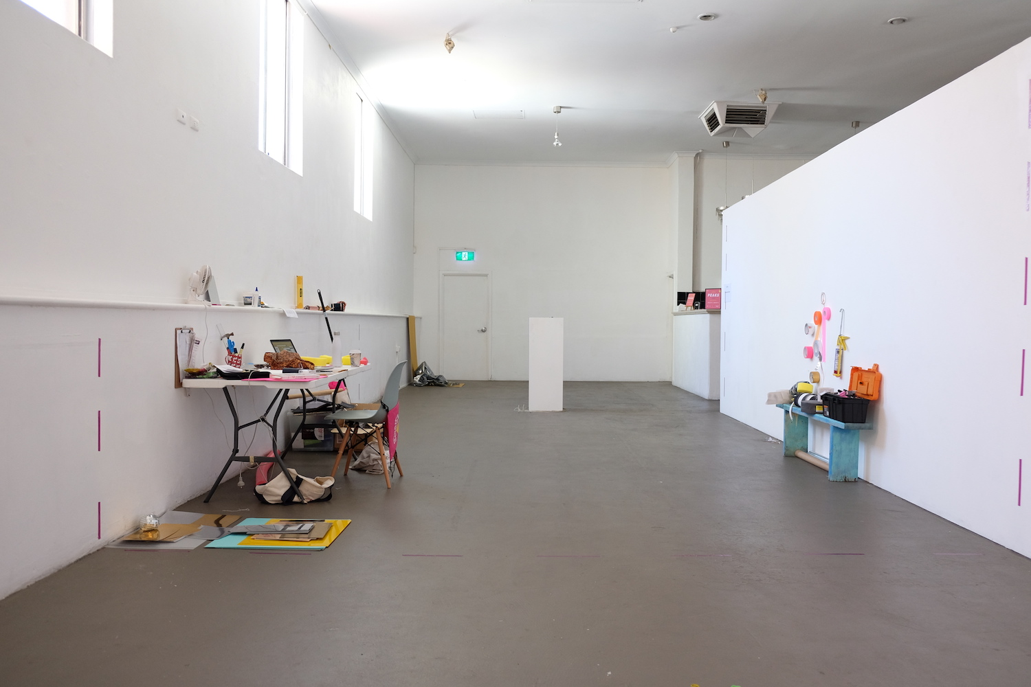 Coming from an architecture background and without any formal training in visual art, Jose Dávila developed a studio practice later in his art career. In a residency Dávila undertook in 2000, in which he struggled to connect to a project in the two short weeks allocated, he constructed for himself a studio which was to be the result of the residency. He says the project came to be “[a] kind of duality in which the result would be the process and the process would be the result” (Craddock & Dávila 2018, 41). Situated outdoors, as a play on the practice of having “open studios”, Open Studio, 2000, consisted of wooden walls and floor, mismatched chairs, a table, and studio paraphernalia. “While I was building, [it] had also become a process of thinking about what a studio is for and all the issues around that. I wasn’t really creating a studio but a ‘stage’ of a studio, a faux studio, a sculpture that resembled a studio” (ibid). Having begun to explore the notion of a residency as a space where all three actions of thinking, making, and showing could take place, I wondered if I could wrestle back some vibrant potential from the uniformity and prosaic nature of a white cube gallery space. This type of question led to a residency projects at Paper Mountain gallery in which I would think about the role of the residency and the gallery and, like Dávila, “the result would be the process and the process would be the result” (ibid).