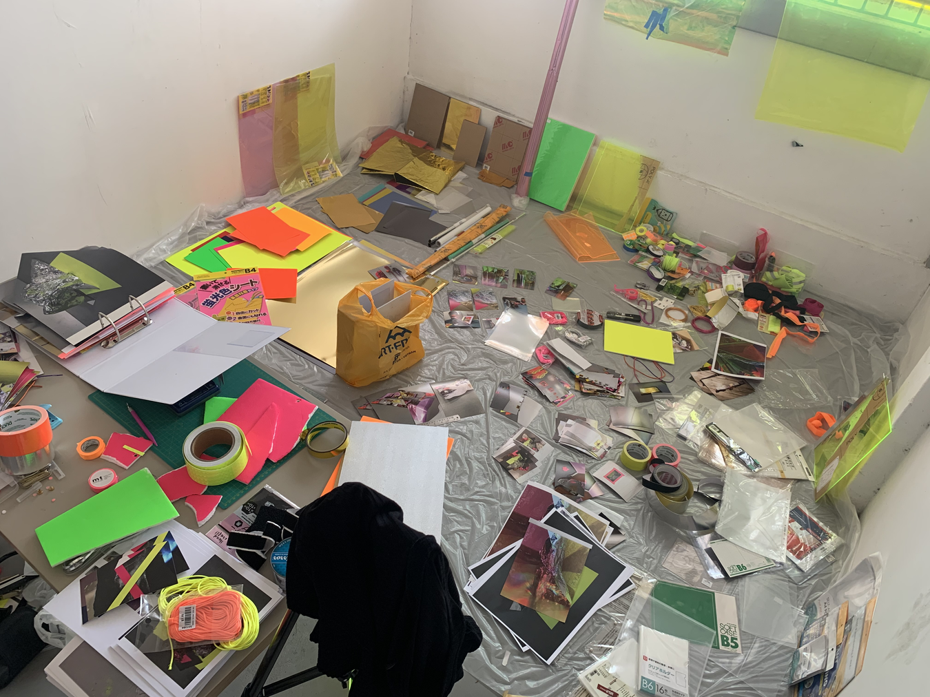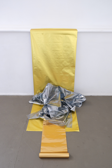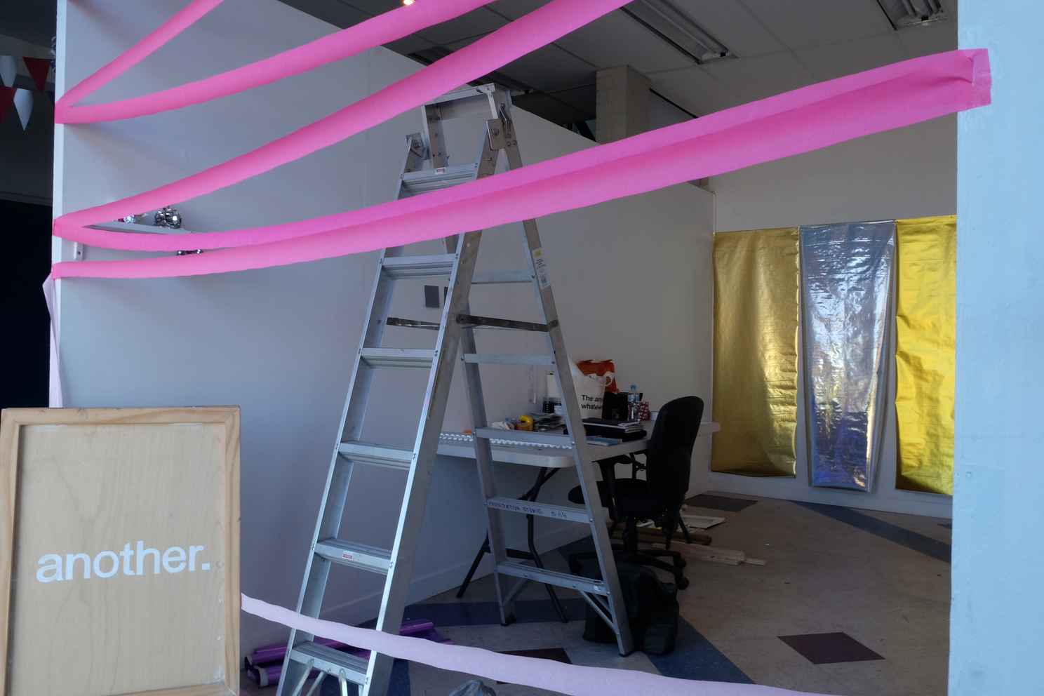 In 2017 I undertook an intensive six-week residency at Another, a small artist-run space housed within a larger building of artist studios in Perth. Being the first planned block of time away from my small studio space at Curtin University, I was yet to know how this time would fit with the rest of the project. Within the loosely converted office building, the rooms with doors were the artist’s studios—carpeted, furnished, stocked full of supplies and “stuff”—while the residency area was the foyer space with makeshift walls and office lino floor that everyone entered into the building through. This residency offered semi-furnishing comprising a trestle table, an office chair, a ladder, and a desk fan. On the first day of the residency, I added a coffee cup, a toolbox, journals, and the last thing I had worked on—a semi-deflated balloon dressed as a disco ball. Over the course of the residency, I scrunched, hung, nailed, coated, flattened, and taped; by all accounts, I gleaned. I often made audio and video recordings of myself and took pictures almost as a reflex to anything that happened in the space. This residency, while four years ago now, still comes back to me and I can recall the space clearly—the light, the quiet, my feelings of apprehension yet excitement. I already felt that this residency would enable me to jump in and get to know my subject matter without too many concerns for aesthetic outcomes, instead supporting development. The space became full of reflective materials like wrapping paper, adhesive vinyl, sequins, and mirrors, as well as miscellaneous things like streamers, balloons, coloured card, various types of tape, and aluminium foil. At this stage in the project, I was still uncertain about the types of matter that might appear more than others. It became clear through my time in the residency space that I was encountering the various objects and materials at hand in a neutral environment due to its retrofitting in a previously occupied space. Its slightly awkward angles, less than solid walls, discoloured linoleum floor—in other words, its inconveniences—made it innocuous and more neutral than the designed neutrality of a white cube gallery space. The subject matter didn’t become something more just by being in the space; things weren’t elevated to demand attention, and the space didn’t change their reading like a gallery might. I could be in proximity with the objects, things and materials anew, and allow intuition and curiosity to drive interactions that helped shift my relationship with and to them.